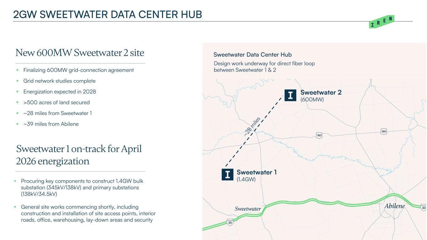 2GW SWEETWATER DATA CENTER HUB 6 New 600MW Sweetwater 2 site  Finalizing 600MW grid-connection agreement  Grid network studies complete  Energization expected in 2028  >500 acres of land secured  ~28 miles from Sweetwater 1  ~39 miles from Abilene  Procuring key components to construct 1.4GW bulk substation (345kV/138kV) and primary substations (138kV/34.5kV)  General site works commencing shortly, including construction and installation of site access points, interior roads, office, warehousing, lay-down areas and security Sweetwater Data Center Hub Design work underway for direct fiber loop between Sweetwater 1 & 2 Sweetwater 1 on-track for April 2026 energization Sweetwater 1 (1.4GW) Sweetwater 2 (600MW)