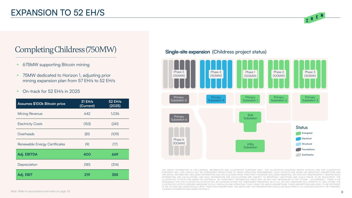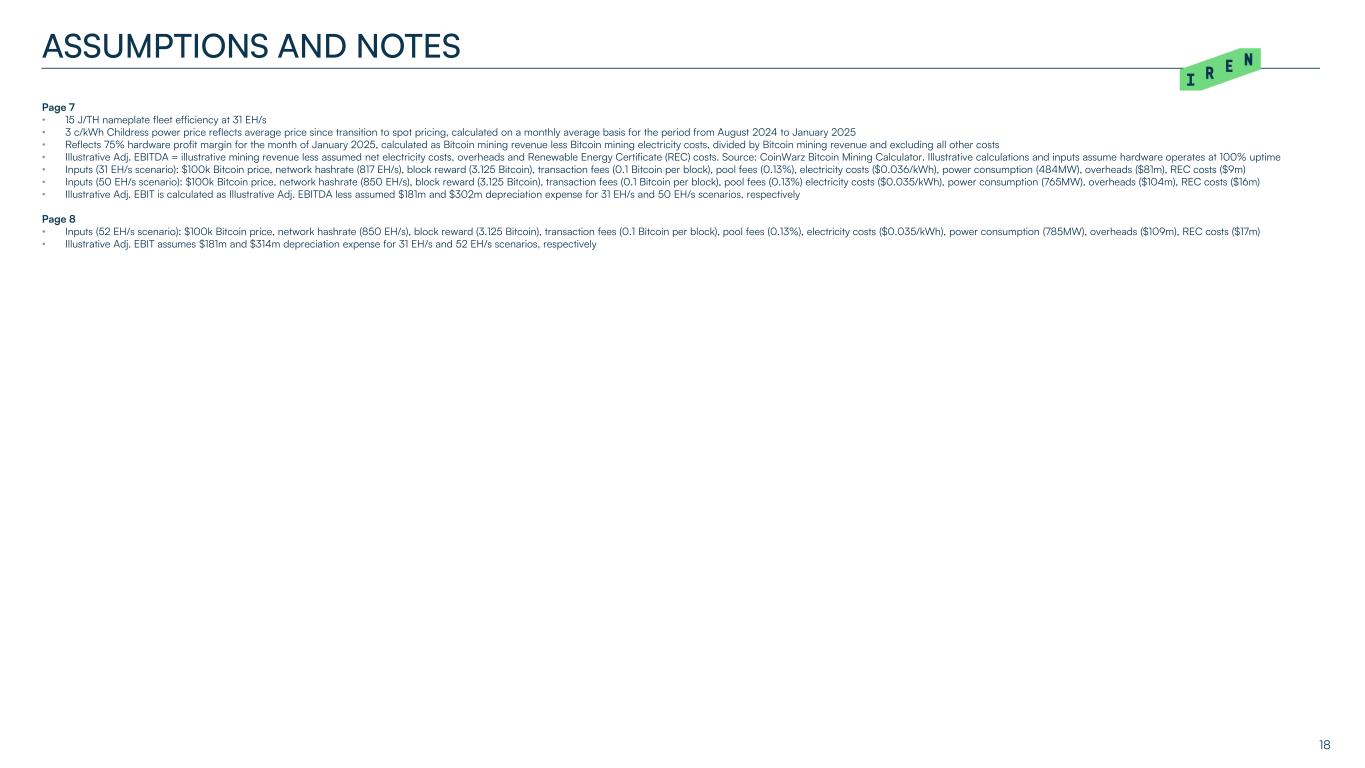 Page 7 • 15 J/TH nameplate fleet efficiency at 31 EH/s • 3 c/kWh Childress power price reflects average price since transition to spot pricing, calculated on a monthly average basis for the period from August 2024 to January 2025 • Reflects 75% hardware profit margin for the month of January 2025, calculated as Bitcoin mining revenue less Bitcoin mining electricity costs, divided by Bitcoin mining revenue and excluding all other costs • Illustrative Adj. EBITDA = illustrative mining revenue less assumed net electricity costs, overheads and Renewable Energy Certificate (REC) costs. Source: CoinWarz Bitcoin Mining Calculator. Illustrative calculations and inputs assume hardware operates at 100% uptime • Inputs (31 EH/s scenario): $100k Bitcoin price, network hashrate (817 EH/s), block reward (3.125 Bitcoin), transaction fees (0.1 Bitcoin per block), pool fees (0.13%), electricity costs ($0.036/kWh), power consumption (484MW), overheads ($81m), REC costs ($9m) • Inputs (50 EH/s scenario): $100k Bitcoin price, network hashrate (850 EH/s), block reward (3.125 Bitcoin), transaction fees (0.1 Bitcoin per block), pool fees (0.13%) electricity costs ($0.035/kWh), power consumption (765MW), overheads ($104m), REC costs ($16m) • Illustrative Adj. EBIT is calculated as Illustrative Adj. EBITDA less assumed $181m and $302m depreciation expense for 31 EH/s and 50 EH/s scenarios, respectively Page 8 • Inputs (52 EH/s scenario): $100k Bitcoin price, network hashrate (850 EH/s), block reward (3.125 Bitcoin), transaction fees (0.1 Bitcoin per block), pool fees (0.13%), electricity costs ($0.035/kWh), power consumption (785MW), overheads ($109m), REC costs ($17m) • Illustrative Adj. EBIT assumes $181m and $314m depreciation expense for 31 EH/s and 52 EH/s scenarios, respectively 18 ASSUMPTIONS AND NOTES