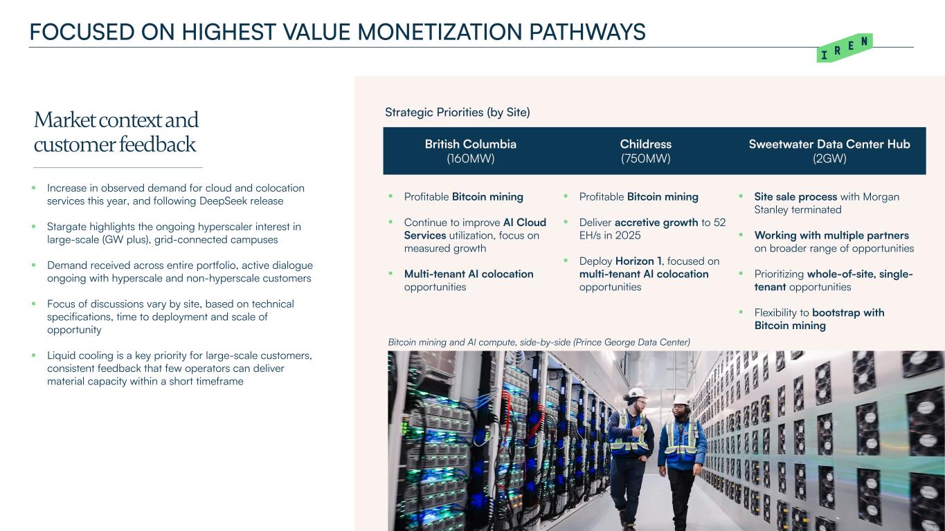 11 FOCUSED ON HIGHEST VALUE MONETIZATION PATHWAYS  Increase in observed demand for cloud and colocation services this year, and following DeepSeek release  Stargate highlights the ongoing hyperscaler interest in large-scale (GW plus), grid-connected campuses  Demand received across entire portfolio, active dialogue ongoing with hyperscale and non-hyperscale customers  Focus of discussions vary by site, based on technical specifications, time to deployment and scale of opportunity  Liquid cooling is a key priority for large-scale customers, consistent feedback that few operators can deliver material capacity within a short timeframe Strategic Priorities (by Site) British Columbia (160MW) Childress (750MW) Sweetwater Data Center Hub (2GW)  Profitable Bitcoin mining  Continue to improve AI Cloud Services utilization, focus on measured growth  Multi-tenant AI colocation opportunities  Profitable Bitcoin mining  Deliver accretive growth to 52 EH/s in 2025  Deploy Horizon 1, focused on multi-tenant AI colocation opportunities  Site sale process with Morgan Stanley terminated  Working with multiple partners on broader range of opportunities  Prioritizing whole-of-site, single- tenant opportunities  Flexibility to bootstrap with Bitcoin mining Bitcoin mining and AI compute, side-by-side (Prince George Data Center) Market context and customer feedback