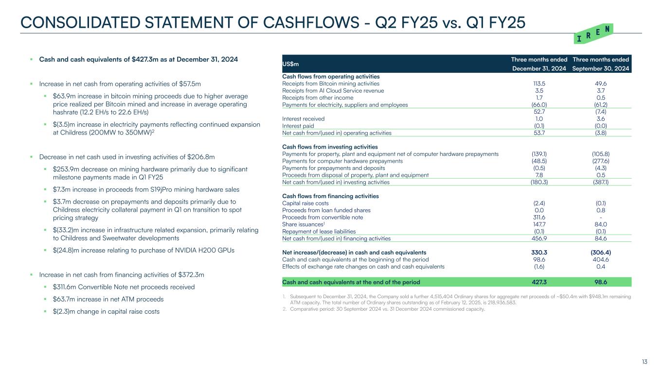 13 CONSOLIDATED STATEMENT OF CASHFLOWS - Q2 FY25 vs. Q1 FY25 1. Subsequent to December 31, 2024, the Company sold a further 4,515,404 Ordinary shares for aggregate net proceeds of ~$50.4m with $948.1m remaining ATM capacity. The total number of Ordinary shares outstanding as of February 12, 2025, is 218,936,583. 2. Comparative period: 30 September 2024 vs. 31 December 2024 commissioned capacity.  Cash and cash equivalents of $427.3m as at December 31, 2024  Increase in net cash from operating activities of $57.5m  $63.9m increase in bitcoin mining proceeds due to higher average price realized per Bitcoin mined and increase in average operating hashrate (12.2 EH/s to 22.6 EH/s)  $(3.5)m increase in electricity payments reflecting continued expansion at Childress (200MW to 350MW)2  Decrease in net cash used in investing activities of $206.8m  $253.9m decrease on mining hardware primarily due to significant milestone payments made in Q1 FY25  $7.3m increase in proceeds from S19jPro mining hardware sales  $3.7m decrease on prepayments and deposits primarily due to Childress electricity collateral payment in Q1 on transition to spot pricing strategy  $(33.2)m increase in infrastructure related expansion, primarily relating to Childress and Sweetwater developments  $(24.8)m increase relating to purchase of NVIDIA H200 GPUs  Increase in net cash from financing activities of $372.3m  $311.6m Convertible Note net proceeds received  $63.7m increase in net ATM proceeds  $(2.3)m change in capital raise costs US$m Three months ended Three months ended December 31, 2024 September 30, 2024 Cash flows from operating activities Receipts from Bitcoin mining activities 113.5 49.6 Receipts from AI Cloud Service revenue 3.5 3.7 Receipts from other income 1.7 0.5 Payments for electricity, suppliers and employees (66.0) (61.2) 52.7 (7.4) Interest received 1.0 3.6 Interest paid (0.1) (0.0) Net cash from/(used in) operating activities 53.7 (3.8) Cash flows from investing activities Payments for property, plant and equipment net of computer hardware prepayments (139.1) (105.8) Payments for computer hardware prepayments (48.5) (277.6) Payments for prepayments and deposits (0.5) (4.3) Proceeds from disposal of property, plant and equipment 7.8 0.5 Net cash from/(used in) investing activities (180.3) (387.1) Cash flows from financing activities Capital raise costs (2.4) (0.1) Proceeds from loan funded shares 0.0 0.8 Proceeds from convertible note 311.6 - Share issuances1 147.7 84.0 Repayment of lease liabilities (0.1) (0.1) Net cash from/(used in) financing activities 456.9 84.6 Net increase/(decrease) in cash and cash equivalents 330.3 (306.4) Cash and cash equivalents at the beginning of the period 98.6 404.6 Effects of exchange rate changes on cash and cash equivalents (1.6) 0.4 Cash and cash equivalents at the end of the period 427.3 98.6