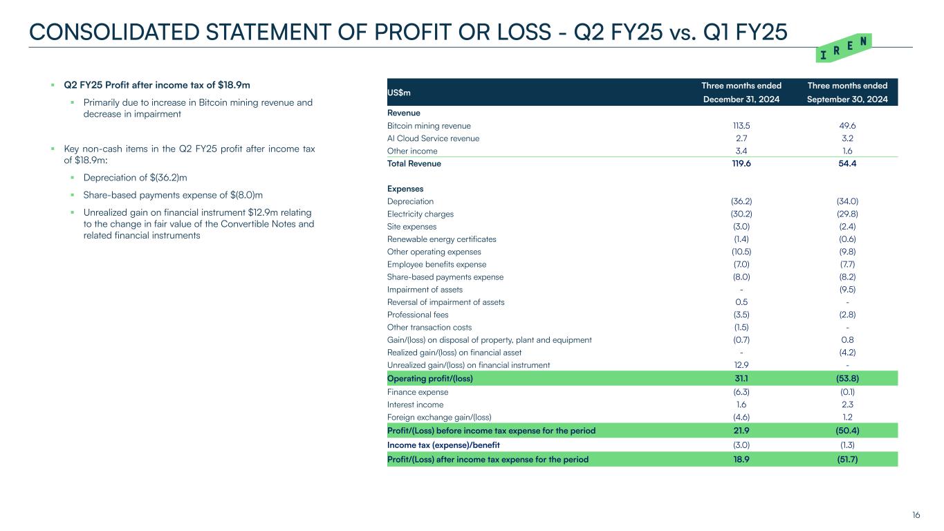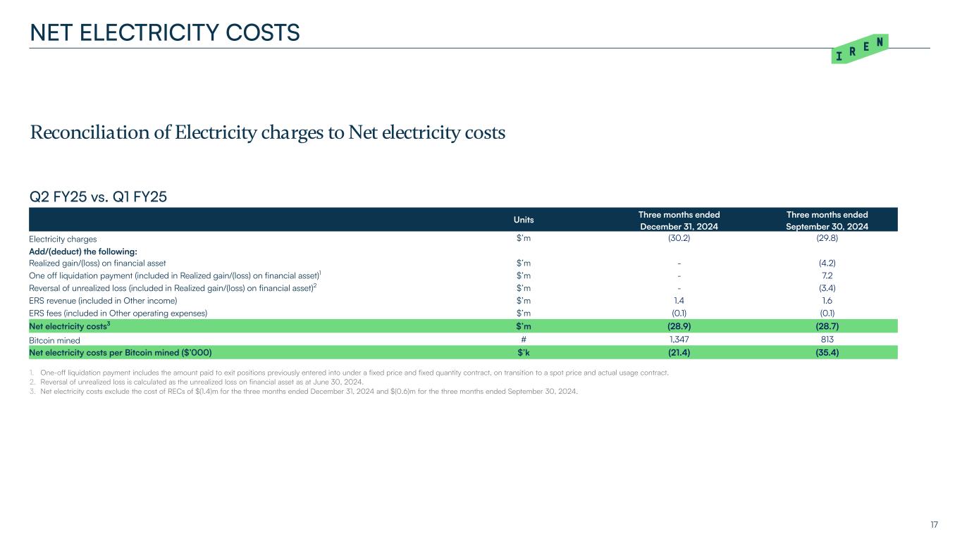 16 CONSOLIDATED STATEMENT OF PROFIT OR LOSS - Q2 FY25 vs. Q1 FY25 US$m Three months ended Three months ended December 31, 2024 September 30, 2024 Revenue Bitcoin mining revenue 113.5 49.6 AI Cloud Service revenue 2.7 3.2 Other income 3.4 1.6 Total Revenue 119.6 54.4 Expenses Depreciation (36.2) (34.0) Electricity charges (30.2) (29.8) Site expenses (3.0) (2.4) Renewable energy certificates (1.4) (0.6) Other operating expenses (10.5) (9.8) Employee benefits expense (7.0) (7.7) Share-based payments expense (8.0) (8.2) Impairment of assets - (9.5) Reversal of impairment of assets 0.5 - Professional fees (3.5) (2.8) Other transaction costs (1.5) - Gain/(loss) on disposal of property, plant and equipment (0.7) 0.8 Realized gain/(loss) on financial asset - (4.2) Unrealized gain/(loss) on financial instrument 12.9 - Operating profit/(loss) 31.1 (53.8) Finance expense (6.3) (0.1) Interest income 1.6 2.3 Foreign exchange gain/(loss) (4.6) 1.2 Profit/(Loss) before income tax expense for the period 21.9 (50.4) Income tax (expense)/benefit (3.0) (1.3) Profit/(Loss) after income tax expense for the period 18.9 (51.7)  Q2 FY25 Profit after income tax of $18.9m  Primarily due to increase in Bitcoin mining revenue and decrease in impairment  Key non-cash items in the Q2 FY25 profit after income tax of $18.9m:  Depreciation of $(36.2)m  Share-based payments expense of $(8.0)m  Unrealized gain on financial instrument $12.9m relating to the change in fair value of the Convertible Notes and related financial instruments