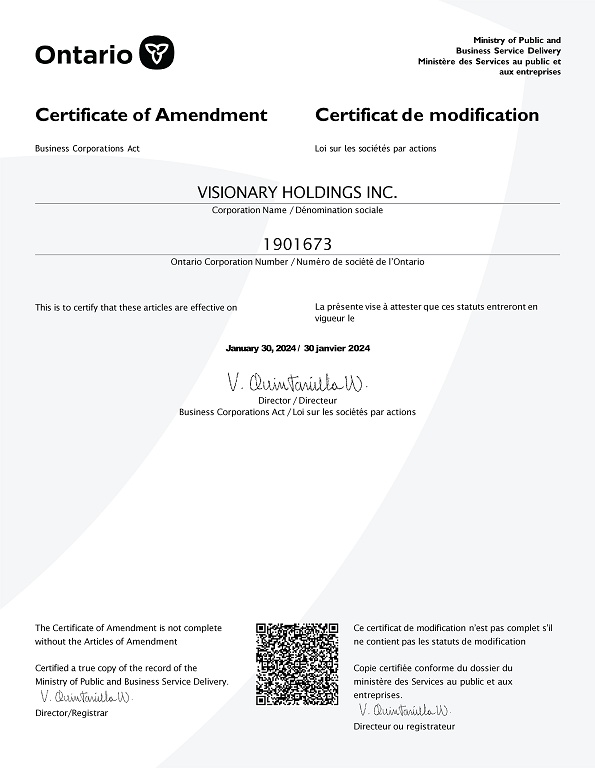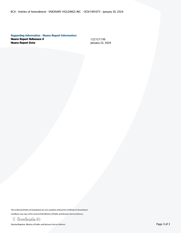 Supporting Information - Nuans Report Information Nuans Report Reference # Nuans Report Date 122121196 January 22, 2024 BCA - Articles of Amendment - VISIONARY HOLDINGS INC. - OCN:1901673 - January 30, 2024 The endorsed Articles of Amendment are not complete without the Certificate of Amendment. Certified a true copy of the record of the Ministry of Public and Business Service Delivery. Page 3 of 3 Director/Registrar, Ministry of Public and Business Service Delivery