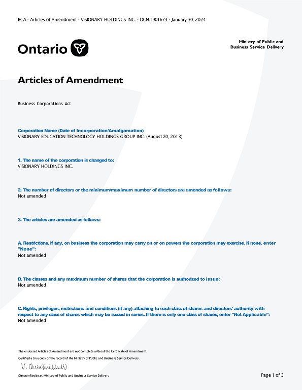 Ministry of Public and Business Service Delivery Articles of Amendment Business Corporations Act Corporation Name (Date of Incorporation/Amalgamation) VISIONARY EDUCATION TECHNOLOGY HOLDINGS GROUP INC. (August 20, 2013) 1. The name of the corporation is changed to: VISIONARY HOLDINGS INC. 2. The number of directors or the minimum/maximum number of directors are amended as follows: Not amended 3. The articles are amended as follows: A. Restrictions, if any, on business the corporation may carry on or on powers the corporation may exercise. If none, enter "None": Not amended B. The classes and any maximum number of shares that the corporation is authorized to issue: Not amended C. Rights, privileges, restrictions and conditions (if any) attaching to each class of shares and directors' authority with respect to any class of shares which may be issued in series. If there is only one class of shares, enter "Not Applicable": Not amended BCA - Articles of Amendment - VISIONARY HOLDINGS INC. - OCN:1901673 - January 30, 2024 The endorsed Articles of Amendment are not complete without the Certificate of Amendment. Certified a true copy of the record of the Ministry of Public and Business Service Delivery. Page 1 of 3 Director/Registrar, Ministry of Public and Business Service Delivery