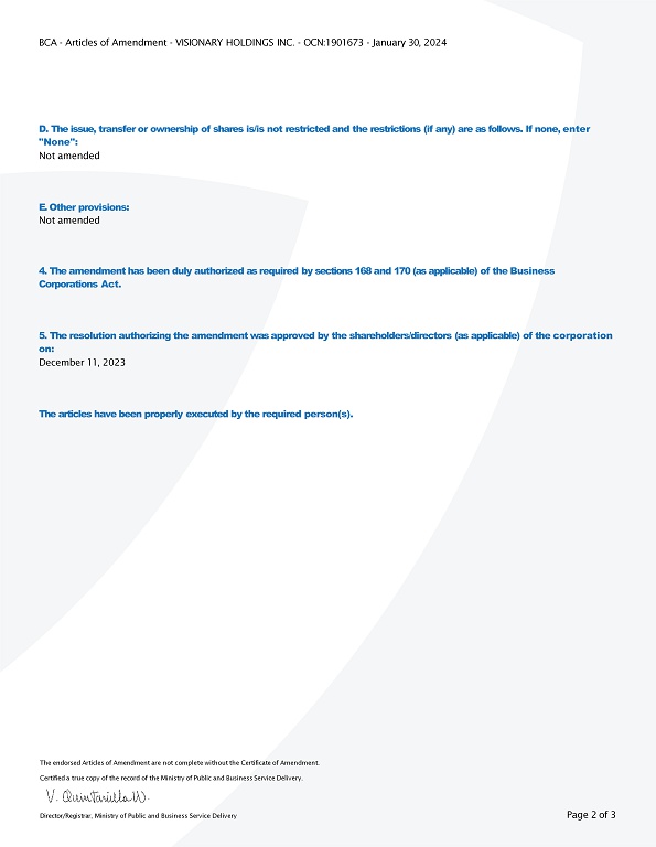 D. The issue, transfer or ownership of shares is/is not restricted and the restrictions (if any) are as follows. If none, enter "None": Not amended E. Other provisions: Not amended 4. The amendment has been duly authorized as required by sections 168 and 170 (as applicable) of the Business Corporations Act. 5. The resolution authorizing the amendment was approved by the shareholders/directors (as applicable) of the corporation on: December 11, 2023 The articles have been properly executed by the required person(s). BCA - Articles of Amendment - VISIONARY HOLDINGS INC. - OCN:1901673 - January 30, 2024 The endorsed Articles of Amendment are not complete without the Certificate of Amendment. Certified a true copy of the record of the Ministry of Public and Business Service Delivery. Page 2 of 3 Director/Registrar, Ministry of Public and Business Service Delivery