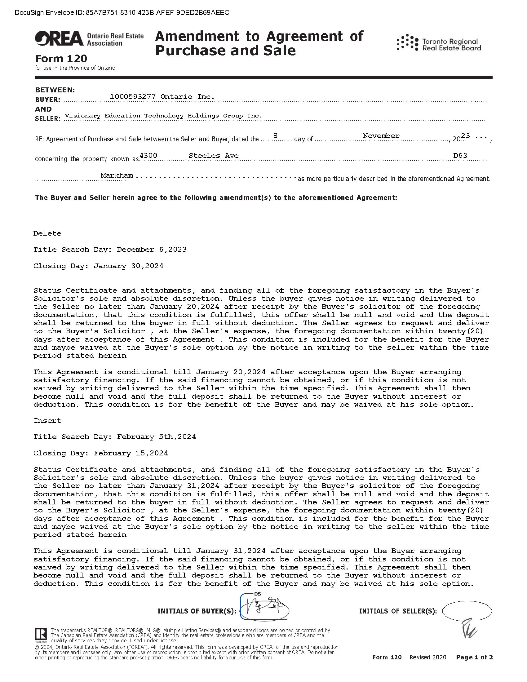 DocuSign Envelope ID: 85A7B751 - 8310 - 423B - AFEF - 9DED2B69AEEC Form 120 for use in the Province of Ontario Amendment to Agreement of Purchase and Sale BETWEEN: BUYER: . . . . . . . . . . . . . . . . . . . . . . . 1 . . 0 . . 0 . . 0 . . . 5 . . 9 . . 3 . . 2 . . 7 .. . 7 . . . . O . . n . . t . . . a . . r . . i . . o . . . . I .. . n . . c . . . . . . . . . . . . . . . . . . . . . . . . . . . . . . . . . . . . . . . . . . . . . . . . . . . . . . . . . . . . . . . . . . . . . . . . . . . . . . . . . . . . . . . . . . . . . . . . . . . . . . . . . . . . . . . . . . . . . . . . . . . . . . . . . . . . . . AND SELLER: . V .. i .. s .. i .. o .. n .. a .. r .. y ... E .. d .. u .. c .. a .. t .. i .. o .. n ... T .. e .. c .. h .. n .. o .. l .. o .. g . y .... H .. o .. l .. d .. i .. n .. g .. s ... G .. r .. o .. u .. p .... I .. n .. c . . ............................................................................................................ RE: Agreement of Purchase and Sale between the Seller and Buyer, dated the . . . . . . 8 . . . . . . . . . day of . . . . . . . . . . . . . . . . . . . . . . . . N . . o . . . v . e . . m .. . b . . e . . r . . . . . . . . . . . . . . . . . . . . . . . . . , 20. 2 .. 3 ... , concerning the property known a s . 4 . . 3 . . 0 . . . 0 . . . . . . . . . . . . . . . . S . . t . . . e . . e . . l . . e . . s . . . . . A . . v . . e . . .. . . . . . . . . . . . . . . . . . . . . . . . . . . . . . . . . . . . . . . . . . . . . . . . . . . . . . . . . . . . . . . . . . . . . . . . . . . . . . . . . . . . . . . . . . . . . . . . . . . . . D .. . 6 . . 3 . . . . . . . . . . . . . . . . . . . . . . . . . . . . . . . . . . . . . . . . . . . M . . . a . r . . . k . . h . . a . . m ................................... as more particularly described in the aforementioned Agreement . The Buyer and Seller herein agree to the following amendment(s) to the aforementioned Agreement : Delete Title Search Day: December 6,2023 Closing Day: January 30,2024 Status Certificate and attachments, and finding all of the foregoing satisfactory in the Buyer's Solicitor's sole and absolute discretion. Unless the buyer gives notice in writing delivered to the Seller no later than January 20,2024 after receipt by the Buyer's solicitor of the foregoing documentation, that this condition is fulfilled, this offer shall be null and void and the deposit shall be returned to the buyer in full without deduction. The Seller agrees to request and deliver to the Buyer's Solicitor , at the Seller's expense, the foregoing documentation within twenty(20) days after acceptance of this Agreement . This condition is included for the benefit for the Buyer and maybe waived at the Buyer's sole option by the notice in writing to the seller within the time period stated herein This Agreement is conditional till January 20,2024 after acceptance upon the Buyer arranging satisfactory financing. If the said financing cannot be obtained, or if this condition is not waived by writing delivered to the Seller within the time specified. This Agreement shall then become null and void and the full deposit shall be returned to the Buyer without interest or deduction. This condition is for the benefit of the Buyer and may be waived at his sole option. Insert Title Search Day: February 5th,2024 Closing Day: February 15,2024 Status Certificate and attachments, and finding all of the foregoing satisfactory in the Buyer's Solicitor's sole and absolute discretion. Unless the buyer gives notice in writing delivered to the Seller no later than January 31,2024 after receipt by the Buyer's solicitor of the foregoing documentation, that this condition is fulfilled, this offer shall be null and void and the deposit shall be returned to the buyer in full without deduction. The Seller agrees to request and deliver to the Buyer's Solicitor , at the Seller's expense, the foregoing documentation within twenty(20) days after acceptance of this Agreement . This condition is included for the benefit for the Buyer and maybe waived at the Buyer's sole option by the notice in writing to the seller within the time period stated herein This Agreement is conditional till January 31,2024 after acceptance upon the Buyer arranging satisfactory financing. If the said financing cannot be obtained, or if this condition is not waived by writing delivered to the Seller within the time specified. This Agreement shall then become null and void and the full deposit shall be returned to the Buyer without interest or deduction. This condition is for the benefit of the Buyer and may be waived at his sole option. INITIALS OF BUYER(S): INITIALS OF SELLER(S): The trademarks REALTOR®, REALTORS®, MLS®, Multiple Listing Services® and associated logos are owned or controlled by The Canadian Real Estate Association (CREA) and identify the real estate professionals who are members of CREA and the quality of services they provide. Used under license. © 2024, Ontario Real Estate Association (“OREA”). All rights reserved. This form was developed by OREA for the use and reproduction by its members and licensees only. Any other use or reproduction is prohibited except with prior written consent of OREA. Do not alter when printing or reproducing the standard pre - set portion. OREA bears no liability for your use of this form. Form 120 Revised 2020 Page 1 of 2