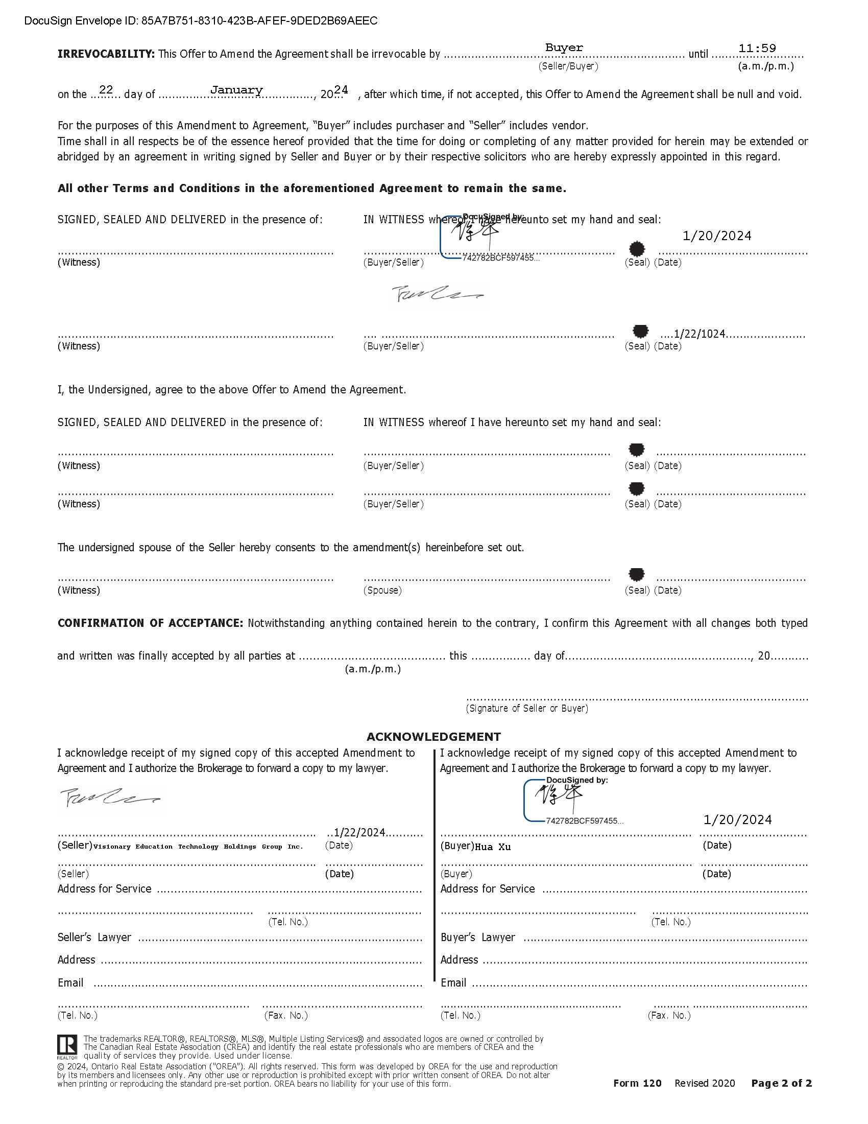 DocuSign Envelope ID: 85A7B751 - 8310 - 423B - AFEF - 9DED2B69AEEC IRREVOCABILITY: This Offer to Amend the Agreement shall be irrevocable by . . . . . . . . . . . . . . . . . . . . . . . . . . . . . . B . . u . . y . . . e . . r . . . . . . . . . . . . . . . . . . . . . . . . . . . . . . . until . . . . . . . . 1 . . . 1 . . : . . 5 . . 9 . . . . . . . . . . (Seller/Buyer) (a.m./p.m.) on the ... 2 .. 2 .... day of . . . . . . . . . . . . . . . . J . . a . . n . . u . . a .. . r . . y . . . . . . . . . . . . . . . ., 20. 2 .. 4 , after which time, if not accepted, this Offer to Amend the Agreement shall be null and void. For the purposes of this Amendment to Agreement, “Buyer” includes purchaser and “Seller” includes vendor. Time shall in all respects be of the essence hereof provided that the time for doing or completing of any matter provided for herein may be extended or abridged by an agreement in writing signed by Seller and Buyer or by their respective solicitors who are hereby expressly appointed in this regard. All other Terms and Conditions in the aforementioned Agreement to remain the same. SIGNED, SEALED AND DELIVERED in the presence of: IN WITNESS whereof I have hereunto set my hand and seal: ............................................................................... (Witness) ........................................................................ (Buyer/Seller) 1/20/2024 ........................................... (Seal) (Date) ............................................................................... (Witness) .... .................................................................... (Buyer/Seller) ....1/22/1024....................... (Seal) (Date) I, the Undersigned, agree to the above Offer to Amend the Agreement. SIGNED, SEALED AND DELIVERED in the presence of: IN WITNESS whereof I have hereunto set my hand and seal: ............................................................................... (Witness) ........................................................................ (Buyer/Seller) ........................................... (Seal) (Date) ............................................................................... (Witness) ........................................................................ (Buyer/Seller) ........................................... (Seal) (Date) The undersigned spouse of the Seller hereby consents to the amendment(s) hereinbefore set out. ............................................................................... (Witness) ........................................................................ (Spouse) ........................................... (Seal) (Date) CONFIRMATION OF ACCEPTANCE: Notwithstanding anything contained herein to the contrary, I confirm this Agreement with all changes both typed and written was finally accepted by all parties at .......................................... this ................. day of....................................................., 20........... (a.m./p.m.) .................................................................................................. (Signature of Seller or Buyer) ACKNOWLEDGEMENT I acknowledge receipt of my signed copy of this accepted Amendment to Agreement and I authorize the Brokerage to forward a copy to my lawyer. I acknowledge receipt of my signed copy of this accepted Amendment to Agreement and I authorize the Brokerage to forward a copy to my lawyer. 1/20/2024 ........................................................................ ............................... .......................................................................... ..1/22/2024........... (Seller) Visionary Education Technology Holdings Group Inc. (Date) .......................................................................... ............................ (Buyer) Hua Xu (Date) (Seller) (Date) Address for Service ............................................................................ ........................................................ ............................................. (Tel. No.) Seller’s Lawyer ................................................................................... Address ............................................................................................ Email ................................................................................................ ....................................................... .............................................. ........................................................................ ............................... (Buyer) (Date) Address for Service ............................................................................ ........................................................ ............................................. (Tel. No.) Buyer’s Lawyer ................................................................................... Address ............................................................................................. Email ................................................................................................ ....................................................... ........... ................................... (Tel. No.) (Fax. No.) (Tel. No.) (Fax. No.) The trademarks REALTOR®, REALTORS®, MLS®, Multiple Listing Services® and associated logos are owned or controlled by The Canadian Real Estate Association (CREA) and identify the real estate professionals who are members of CREA and the quality of services they provide. Used under license. © 2024, Ontario Real Estate Association (“OREA”). All rights reserved. This form was developed by OREA for the use and reproduction by its members and licensees only. Any other use or reproduction is prohibited except with prior written consent of OREA. Do not alter when printing or reproducing the standard pre - set portion. OREA bears no liability for your use of this form. Form 120 Revised 2020 Page 2 of 2