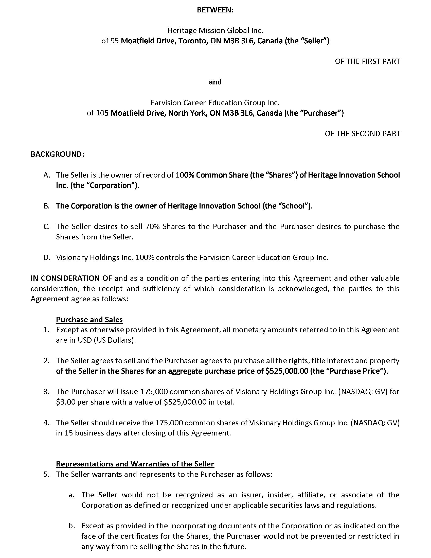 BETWEEN: Heritage Mission Global Inc. of 95 OF THE FIRST PART and Farvision Career Education Group Inc. of 10 OF THE SECOND PART BACKGROUND: A. The Seller is the owner of record of 10 B. C. The Seller desires to sell 70% Shares to the Purchaser and the Purchaser desires to purchase the Shares from the Seller. D. Visionary Holdings Inc. 100% controls the Farvision Career Education Group Inc. IN CONSIDERATION OF and as a condition of the parties entering into this Agreement and other valuable consideration, the receipt and sufficiency of which consideration is acknowledged, the parties to this Agreement agree as follows : Purchase and Sales 1. Except as otherwise provided in this Agreement, all monetary amounts referred to in this Agreement are in USD (US Dollars). 2. The Seller agrees to sell and the Purchaser agrees to purchase all the rights, title interest and property 3. The Purchaser will issue 175,000 common shares of Visionary Holdings Group Inc. (NASDAQ: GV) for $3.00 per share with a value of $525,000.00 in total. 4. The Seller should receive the 175,000 common shares of Visionary Holdings Group Inc. (NASDAQ: GV) in 15 business days after closing of this Agreement. Representations and Warranties of the Seller 5. The Seller warrants and represents to the Purchaser as follows: a. The Seller would not be recognized as an issuer, insider, affiliate, or associate of the Corporation as defined or recognized under applicable securities laws and regulations . b. Except as provided in the incorporating documents of the Corporation or as indicated on the face of the certificates for the Shares, the Purchaser would not be prevented or restricted in any way from re - selling the Shares in the future .