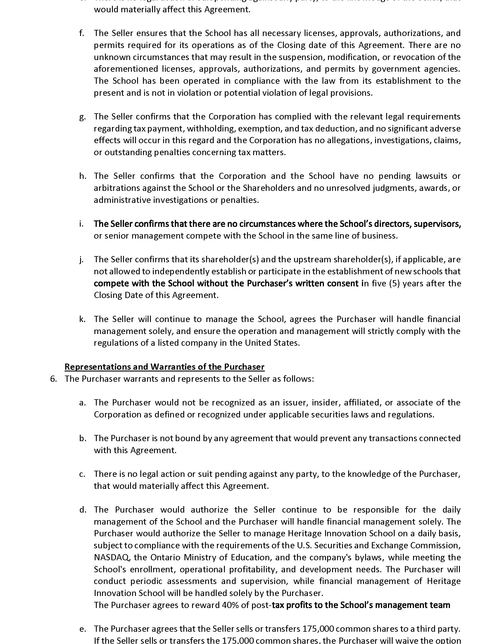 would materially affect this Agreement. f. The Seller ensures that the School has all necessary licenses, approvals, authorizations, and permits required for its operations as of the Closing date of this Agreement . There are no unknown circumstances that may result in the suspension, modification, or revocation of the aforementioned licenses, approvals, authorizations, and permits by government agencies . The School has been operated in compliance with the law from its establishment to the present and is not in violation or potential violation of legal provisions . g. The Seller confirms that the Corporation has complied with the relevant legal requirements regarding tax payment, withholding, exemption, and tax deduction, and no significant adverse effects will occur in this regard and the Corporation has no allegations, investigations, claims, or outstanding penalties concerning tax matters . h. The Seller confirms that the Corporation and the School have no pending lawsuits or arbitrations against the School or the Shareholders and no unresolved judgments, awards, or administrative investigations or penalties . i. or senior management compete with the School in the same line of business. j. The Seller confirms that its shareholder(s) and the upstream shareholder(s), if applicable, are not allowed to independently establish or participate in the establishment of new schools that n five (5) years after the Closing Date of this Agreement. k. The Seller will continue to manage the School, agrees the Purchaser will handle financial management solely, and ensure the operation and management will strictly comply with the regulations of a listed company in the United States . Representations and Warranties of the Purchaser 6. The Purchaser warrants and represents to the Seller as follows: a. The Purchaser would not be recognized as an issuer, insider, affiliated, or associate of the Corporation as defined or recognized under applicable securities laws and regulations . b. The Purchaser is not bound by any agreement that would prevent any transactions connected with this Agreement . c. There is no legal action or suit pending against any party, to the knowledge of the Purchaser, that would materially affect this Agreement . d. The Purchaser would authorize the Seller continue to be responsible for the daily management of the School and the Purchaser will handle financial management solely . The Purchaser would authorize the Seller to manage Heritage Innovation School on a daily basis, subject to compliance with the requirements of the U . S . Securities and Exchange Commission, NASDAQ, the Ontario Ministry of Education, and the company's bylaws, while meeting the School's enrollment, operational profitability, and development needs . The Purchaser will conduct periodic assessments and supervision, while financial management of Heritage Innovation School will be handled solely by the Purchaser . The Purchaser agrees to reward 40 % of post - e. The Purchaser agrees that the Seller sells or transfers 175,000 common shares to a third party. If the Seller sells or transfers the 175,000 common shares, the Purchaser will waive the option
