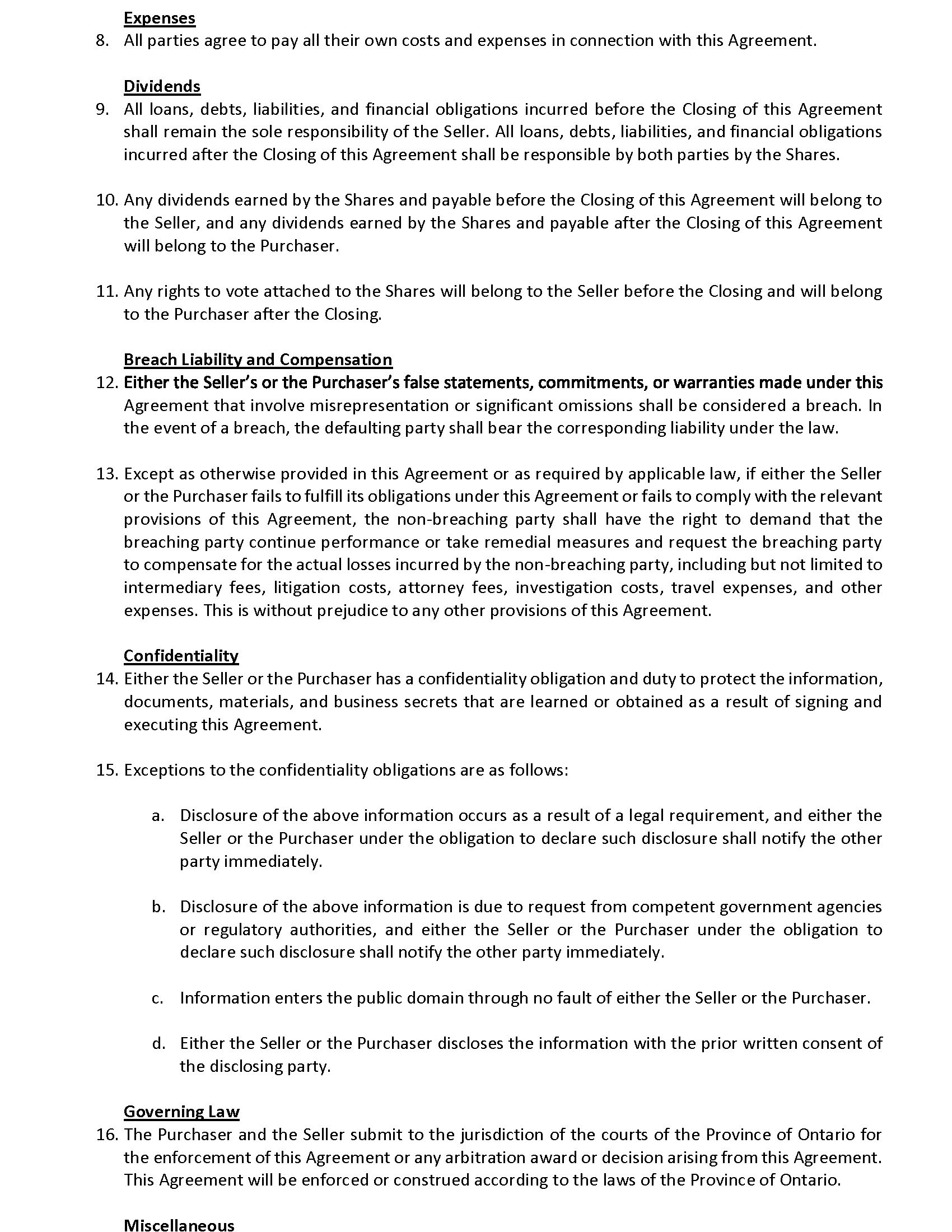Expenses 8. All parties agree to pay all their own costs and expenses in connection with this Agreement. Dividends 9. All loans, debts, liabilities, and financial obligations incurred before the Closing of this Agreement shall remain the sole responsibility of the Seller . All loans, debts, liabilities, and financial obligations incurred after the Closing of this Agreement shall be responsible by both parties by the Shares . 10. Any dividends earned by the Shares and payable before the Closing of this Agreement will belong to the Seller, and any dividends earned by the Shares and payable after the Closing of this Agreement will belong to the Purchaser . 11. Any rights to vote attached to the Shares will belong to the Seller before the Closing and will belong to the Purchaser after the Closing . Breach Liability and Compensation 12. Agreement that involve misrepresentation or significant omissions shall be considered a breach. In the event of a breach, the defaulting party shall bear the corresponding liability under the law. 13. Except as otherwise provided in this Agreement or as required by applicable law, if either the Seller or the Purchaser fails to fulfill its obligations under this Agreement or fails to comply with the relevant provisions of this Agreement, the non - breaching party shall have the right to demand that the breaching party continue performance or take remedial measures and request the breaching party to compensate for the actual losses incurred by the non - breaching party, including but not limited to intermediary fees, litigation costs, attorney fees, investigation costs, travel expenses, and other expenses . This is without prejudice to any other provisions of this Agreement . Confidentiality 14. Either the Seller or the Purchaser has a confidentiality obligation and duty to protect the information, documents, materials, and business secrets that are learned or obtained as a result of signing and executing this Agreement. 15. Exceptions to the confidentiality obligations are as follows: a. Disclosure of the above information occurs as a result of a legal requirement, and either the Seller or the Purchaser under the obligation to declare such disclosure shall notify the other party immediately . b. Disclosure of the above information is due to request from competent government agencies or regulatory authorities, and either the Seller or the Purchaser under the obligation to declare such disclosure shall notify the other party immediately . c. Information enters the public domain through no fault of either the Seller or the Purchaser. d. Either the Seller or the Purchaser discloses the information with the prior written consent of the disclosing party . Governing Law 16. The Purchaser and the Seller submit to the jurisdiction of the courts of the Province of Ontario for the enforcement of this Agreement or any arbitration award or decision arising from this Agreement . This Agreement will be enforced or construed according to the laws of the Province of Ontario . Miscellaneous