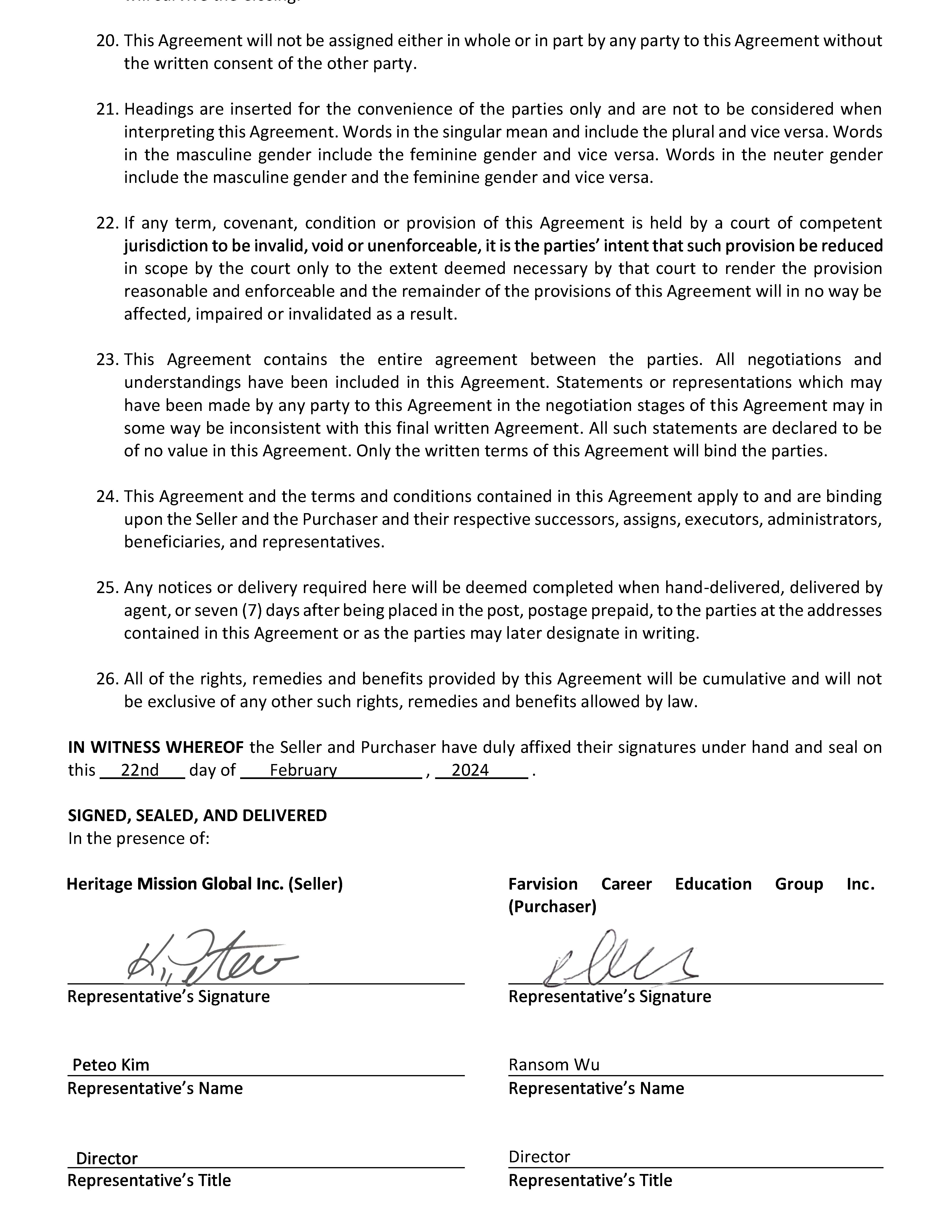 20. This Agreement will not be assigned either in whole or in part by any party to this Agreement without the written consent of the other party . 21. Headings are inserted for the convenience of the parties only and are not to be considered when interpreting this Agreement . Words in the singular mean and include the plural and vice versa . Words in the masculine gender include the feminine gender and vice versa . Words in the neuter gender include the masculine gender and the feminine gender and vice versa . 22. If any term, covenant, condition or provision of this Agreement is held by a court of competent in scope by the court only to the extent deemed necessary by that court to render the provision reasonable and enforceable and the remainder of the provisions of this Agreement will in no way be affected, impaired or invalidated as a result . 23. This Agreement contains the entire agreement between the parties . All negotiations and understandings have been included in this Agreement . Statements or representations which may have been made by any party to this Agreement in the negotiation stages of this Agreement may in some way be inconsistent with this final written Agreement . All such statements are declared to be of no value in this Agreement . Only the written terms of this Agreement will bind the parties . 24. This Agreement and the terms and conditions contained in this Agreement apply to and are binding upon the Seller and the Purchaser and their respective successors, assigns, executors, administrators, beneficiaries, and representatives . 25. Any notices or delivery required here will be deemed completed when hand - delivered, delivered by agent, or seven ( 7 ) days after being placed in the post, postage prepaid, to the parties at the addresses contained in this Agreement or as the parties may later designate in writing . 26. All of the rights, remedies and benefits provided by this Agreement will be cumulative and will not be exclusive of any other such rights, remedies and benefits allowed by law . IN WITNESS WHEREOF the Seller and Purchaser have duly affixed their signatures under hand and seal on this 22nd day of February , 2024 . SIGNED, SEALED, AND DELIVERED In the presence of: Heritage (Seller) Farvision (Purchaser) Career Education Group Inc. Ransom Wu Director