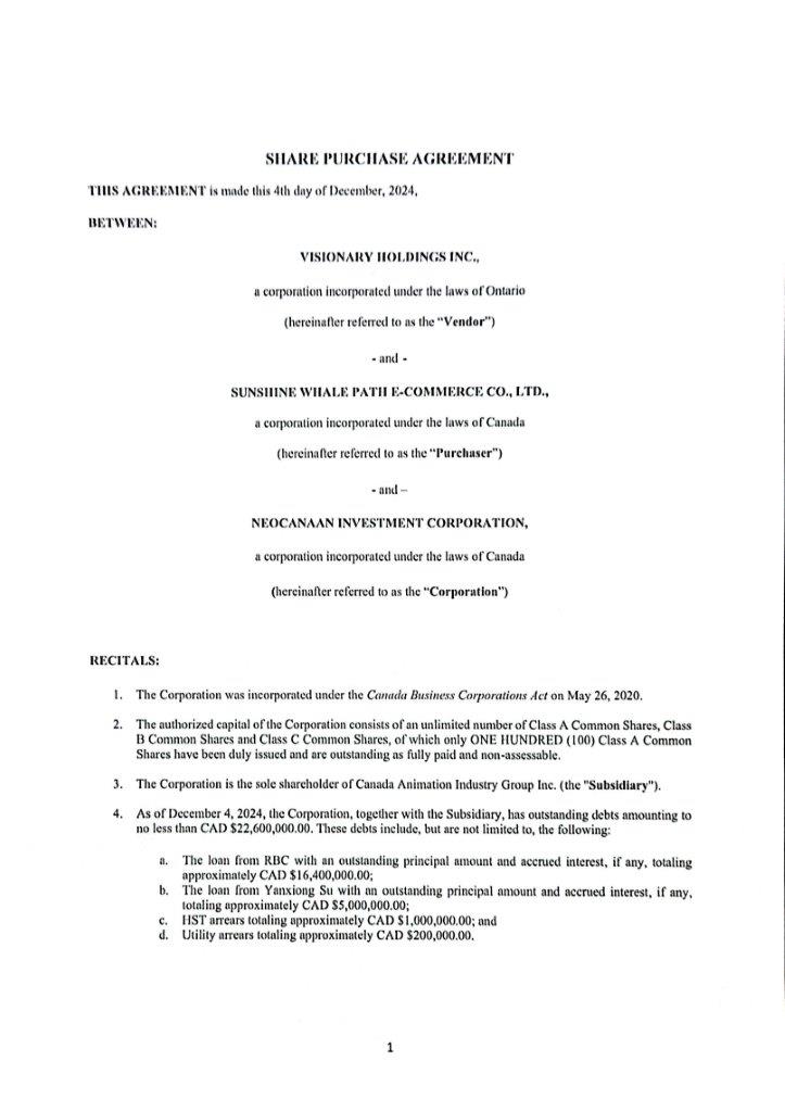 SIIAltE l'IJltCIIASE A(;ltEEMENT TIIIS AGIU:EI \ I ENT Is 111 1 11h: lhl s 41h dny ol' I > ece mhcr, 2 024. 111 - :'l'WEEN: VISIONAHV 11O1.l>IN<;S INC., 11 corpornlion incorporntcd under the lnw !I ol'Ontnrio (hercinnfh :r referred ton s the "Vendor") - 11nd • SUNSIIINE WIIAI.E l'ATII E - C OMMEHCF. CO., I.TO ., 11 eorpornlion incorpornlcd under lhe lnws of C anada (herein11f1cr referred to ns lhc "l'urchnscr") - and - NEOCANAAN INVESTMENT COHPORATION, a corpornlion incorpornlcd under the lnw s of Cn nndn (hercinnf \ cr referred ton s the "Coqiorntlon") HF.CITAI.S: I. The Cor poration wns incoqlOratcd under the Cruuu la 811 s i11t's s Co 171 o rafi o 11 s Act on May 26, 2020. 2. The nulhorizcd cnpitnl of the Corporation consists o r nn unlimited number of Class A Common Shares, Cla ss D Common Shares nnd Class C Common Shnrcs, of which only ONE HUNDRED ( 100 ) Class A Common Shares hnvc b ee n duly i ss u e d nnd arc outslanding a s fully paid and non - a ss e ssa ble . 3. The Co rporntion is the so le s hareholder of Canada Animal ion Indu s try Group Inc . (the "Subsidiary") . 4. As of December 4 , 2024 , the Cor porntion, together wilh the Sub s idinry, hn s outstanding debt s nmounting to no less th an CAD $ 22 , 600 , 000 . 00 . These d e bt s include, but arc not limited to, the following : n . The lo a n from RU C wilh nn outsl11nding prin c ipnl nmount nnd nc cmcd intere s t. if any, totnling npproximntcly CAD $16.400,000.00; b. The 10 11 11 from Ynnxiong Su with nn outstnnding principal amount and accmcd intere st, if any, totnling npproximntcly C AD $5,000,000.00 ; c. 11ST nrrc11rs tol11ling 11pproxim11tcly CAD $1,000,000.00; und d. Utility 11rrc11rs toluling npproximutdy C AD $200 , 000.00. 1