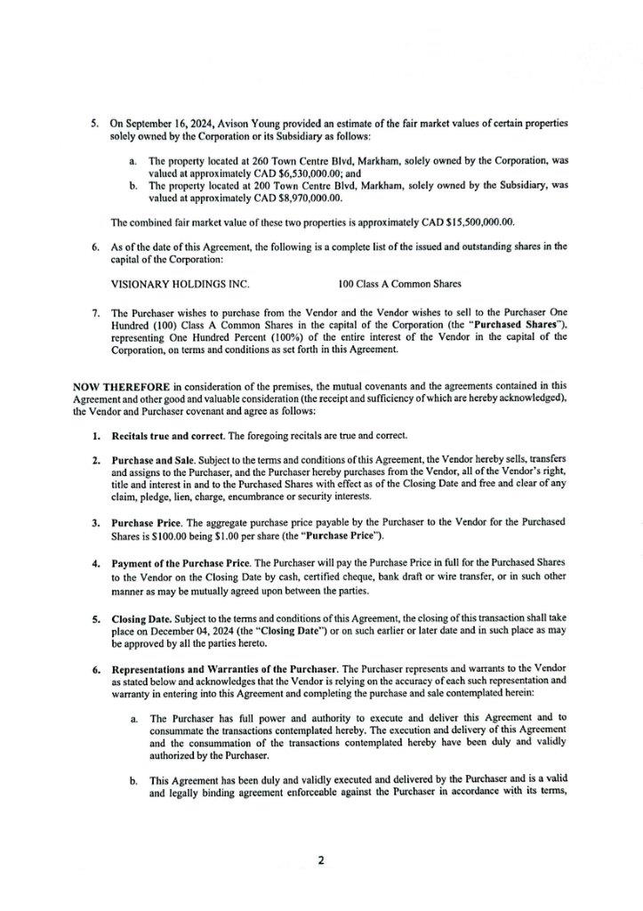 5. On September 16 , 2024 , Avison Young provided an estimate of the fair market values of certain properties solely owned by the Corporation or its Subsidiary as follows : a. The property located at 260 Town Ce ntre Blvd, Markham , solely owned by the Corporation, was valued at approximately C AD $6,530 , 000.00; and b. The property located at 200 Town Centre Blvd , Markham , solely owned by the Subsidiary, was valued at approximately CAD $8,970,000.00. The combined fair market value of these two propertie s i s approximately CAD $15 , 500,000.00. 6. As of the date of thi s Agreement, the following i s a complete list of the is s ued and outstanding s hare s in the capital of the Corporation : VISIONARY HOLDINGS INC . I 00 Class A Common Shar es 7. The Purchaser wishes to purchase from the Vendor and the Vendor wi s hes to sell to th e Purch ase r One Hundred ( 100 ) Class A Common Share s in the capital of the Corporation (the "Purchased Shares") , repre se nting One Hundred Percent ( 100 % ) of the entire intere s t of the Vendor in the capital of the Corporation, on tem 1 s and conditions as set forth in this Agreement . NOW THEREFORE in consideration of the premi ses, the mutual covenants and the agreements contained in thi s Agreement and other good and valuable consideration (the receipt and sufficiency of which are hereby acknowledged), the Vendor and Purcha se r covenant and agree as follows : I. Recitals true and correct. The foregoing recital s are true and correct. 2. Purchase and Sale . Subj ec t to the terms and conditions of this Agreement, the Vendor hereby sells , transfers and assigns to the Purchaser, and the Purchaser hereby purchases from the Vendor, all of the Vendor's right , title and intere s t in and to the Purcha se d Shares with effect as of the Closing Date and free and clear of any claim, pledge, lien, charge, encumbrance or security interests . 3. Purchase Price . The aggregate purchase price payable by the Purchaser to the Vendor for the Purch ase d Shares is $ 100 . 00 being $ 1 . 00 per share (the "Purchase Price " ) . 4. Payment of the Purchase Price . The Purchaser will pay the Purchase Price in full for the Purcha se d Shares to the Vendor on the Closing Date by cash, certified cheque, bank draft or wire transfer, or in such other manner as may be mutually agreed upon between the partie s . 5. Closing Date . Subject to the terms and conditions of thi s Agreement, the closin g of this transaction s hall take place on December 04 , 2024 (the "C losing Date") or on such earlier or later date and in such plac e as m ay be approved by all the partie s hereto . 6. Representations and Warranties of the Purchaser . The Purcha se r repre se nts and warrants to the Vendor as stated below and acknowledges that th e Vendor is relying on the accuracy of each such r e presentation and warranty in entering into this Agreement and completing the purcha se and sale contemplated h e rein : a. The Purcha se r ha s full power and authority to execute and d e liver this Agreement and to consummate th e transactions contemplated hereby . The execution and delivery of this Agreement and the consummation of the transaction s contemplated h e reby have been duly and validly authorized by the Purchaser . b. This Agreement has been duly and validly executed and delivered by the Purchaser and is a valid and legally binding agreement enforceable against the Purchaser in accordance w \ th its terms, 2