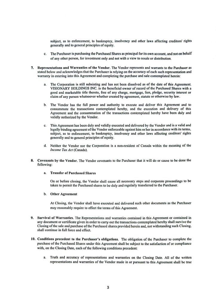 subjecl , o s to enforcement, lo bankruptcy, in s olvency a nd other laws affecting creditors' right s generally and to general principles of equity. c . The Purcha s er is p 11 rch 1111 ing the Purcha s ed Shore s ns principal for it s own account , and not on behalf of any olher person , for investment only ond not wilh o view to re s ale or di s tribution . 7. Ucprcscnt 11 llons nnd W 11 rrnnllu or the Vendor . The Vendor repre s ents and warrants to the Purchaser a s staled below ond acknowledge s thnl the Purchaser i s relying on 1 he accuracy of each s uch representation and warranty in entering inlo this Agreemenl and completing the purchase and sale contemplated herein : a. The Corporation i s still subsisting and hos not been dis s olved a s of the date of thi s Agr e ement . VISIONARY HOLDINGS INC . is the beneficial owner of record of the Purcha s ed Shares with a good and marketable title thereto, free of ony charge, mortgage, lien, pled g e , security intere s t or claim of any person whatsoever whether created by agreement , statute or otherwi s e by law . b. The Vendor has the full power and authority to execute and deliver thi s Agreement and to con s ummate the tran s actions contemplated hereby , and the execution and delivery of thi s A g reement and the consummation of the tran s actions contemplated hereby have been duly and validly authorized by the Vendor . e . This Agreement ho s been duly and validly executed and delivered by the Vendor and i s a valid and legally binding a g reement of the Vendor enforceable a g ain s t him or her in accordance with it s term s , subject, os to enforcement, to bankruptcy, insolvency and other law s affecting creditor s ' right s generally and to general principle s of equity . d . Neither the Vendor nor the Corporation i s a non - re s ident of Canada within the meanin g of the /11 c om e Tax A c t (Canada). 8. Covennnts by the Vendor . The Vendor cov e nants to the Purcha s er that it will do or cau s e to be done the following : a. Trnnsrcr of Purchased Shares On or before closing, the Vendor shall cau s e all neces s ary s tep s and corporate proceeding s to be taken to permit the Purchased shares to be duly and regularly transferred to the Purcha s er. b. Other Agr e ement At Clo s ing , the Vendor shall have executed and deliv e red such other documents as the Purcha s er may reasonably require lo effect the terms of this Agreement. 9. Survival of Warranties . The Representation s and warrantie s contained in thi s Agreement or contained in any document or certificate given in order to carry out the transactions contemplated hereby shall survive the Closing of the sale and purcha s e of the Purchased shares provided h e rein and, not with s tanding such Clo s ing . shall continue in full force and effect . JO . Conditions precedent to the Purchaser's obligations . The obligation of the Purcha s er to complete the purcha s e of the Purchased Shares under this Agreem e nt s hall be subject to the satisfaction of or compliance with, on the Closing Date, each of the following conditions precedent : a. Truth and accuracy of repre s entations and warranties on the Closing Date . All of the written representations and warranties of the Vendor made in or pursuant to this Agreement shall be tme 3