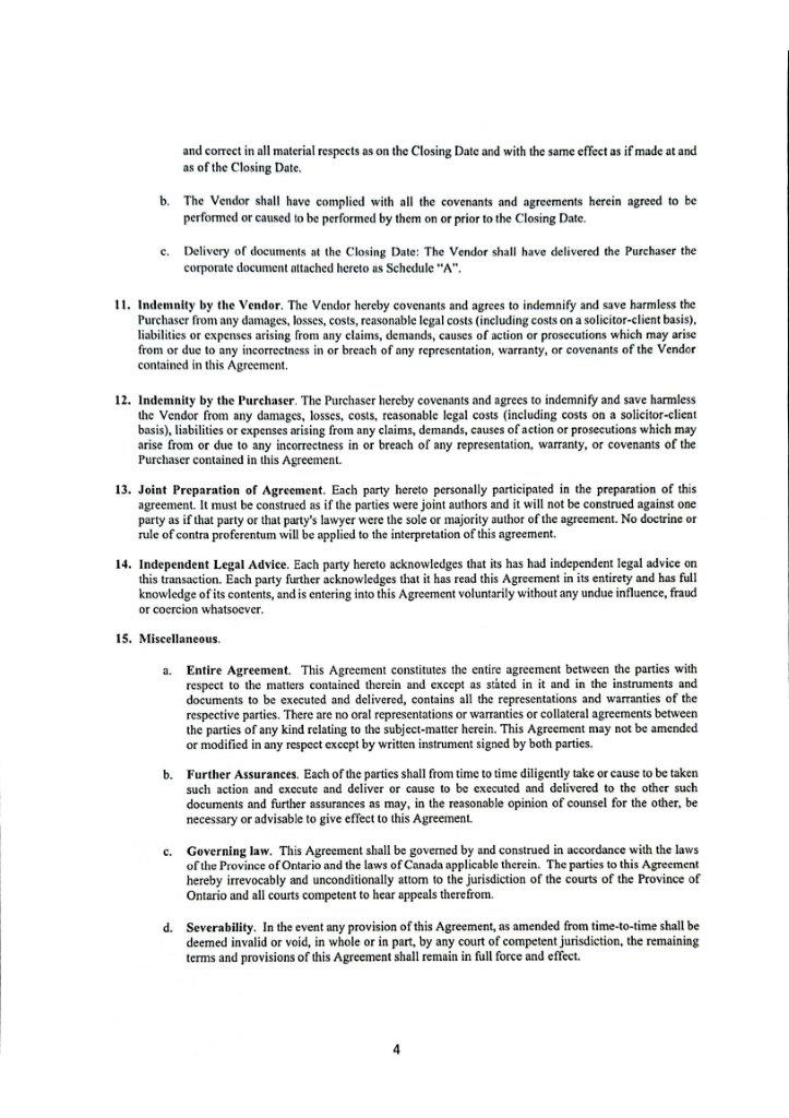 and correct in all material respects as on the Closing Dale and with the same effect as if made at and as of the Closing Dale . b. The Vendor shall have complied with all the covenants and agreements herein agreed to be perfonned or caused lo be performed by them on or prior to the Closing Date . c. Delivery of documents al the Closing Dale : The Vendor shall have delivered the Purchaser the corpornle document attached hereto ns Schedule "A" . 11. Indemnity by the Vendor . The Vendor hereby covenants and agrees to indemnify and save harmless the Purchaser from any damages, losses , costs, reasonable legal costs (including co s ts on a solicitor - client basi s ) , liabilities or expen s es arising from any claims, demands, causes of action or prosecutions which may ari s e from or due to any incorrectness in or breach of any representation, warranty, or covenants of the Vendor contained in this Agreement . 12. Indemnity by the Purchaser . The Purchaser hereby covenants and agrees to indemnify and save harmless the Vendor from any damages, losses, costs, reasonable legal costs (including costs on a solicitor - client basis) , liabilities or expenses arising from any claims, demands, causes of action or prosecutions which may arise from or due to any incorrectness in or breach of any representation , warranty, or covenants of the Purchaser contained in this Agreement . 13. Joint Preparation of Agreement . Each party hereto personally participated in the preparation of this agreement . It must be construed as if the parties were joint authors and it will not be construed against one party as if that party or that party's lawyer were the sole or majority author of the agreement . No doctrine or rule of contra proferentum will be applied to the interpretation of this agreement . 14. Independent Legal Advice . Each party hereto acknowledges that its has had independent legal advice on this transaction . Each party further acknowledges that it has read this Agreement in its entirety and has full knowledge of its contents, and is entering into this Agreement voluntarily without any undue influence, fraud or coercion whatsoever . 15. Miscellaneous. a. Entire Agreement . This Agreement constitutes the entire agreement between the parties with respect to the matters contained therein and except as stated in it and in the instruments and documents to be executed and delivered, contains all the representations and warranties of the respective parties . There are no oral representations or warranties or collateral agreements between the parties of any kind relating to the subject - matter herein . This Agreement may not be amended or modified in any respect except by written instrument signed by both parties . b. Further Assurances . Each of the parties shall from time to time diligently take or cause to be taken such action and execute and deliver or cause to be executed and delivered to the other such documents and further assurances as may, in the reasonable opinion of counsel for the other, be necessary or advisable to give effect to this Agreement . c. Governing law . This Agreement shall be governed by and construed in accordance with the laws of the Province of Ontario and the laws of Canada applicable therein . The parties to this Agreement hereby irrevocably and unconditionally attorn to the jurisdiction of the courts of the Province of Ontario and all courts competent to hear appeals therefrom . d. Severability . In the event any provision of this Agreement, as amended from time - to - time shall be deemed invalid or void, in whole or in part, by any court of competent jurisdiction, the remaining terms and provisions of this Agreement shall remain in full force and effect . 4