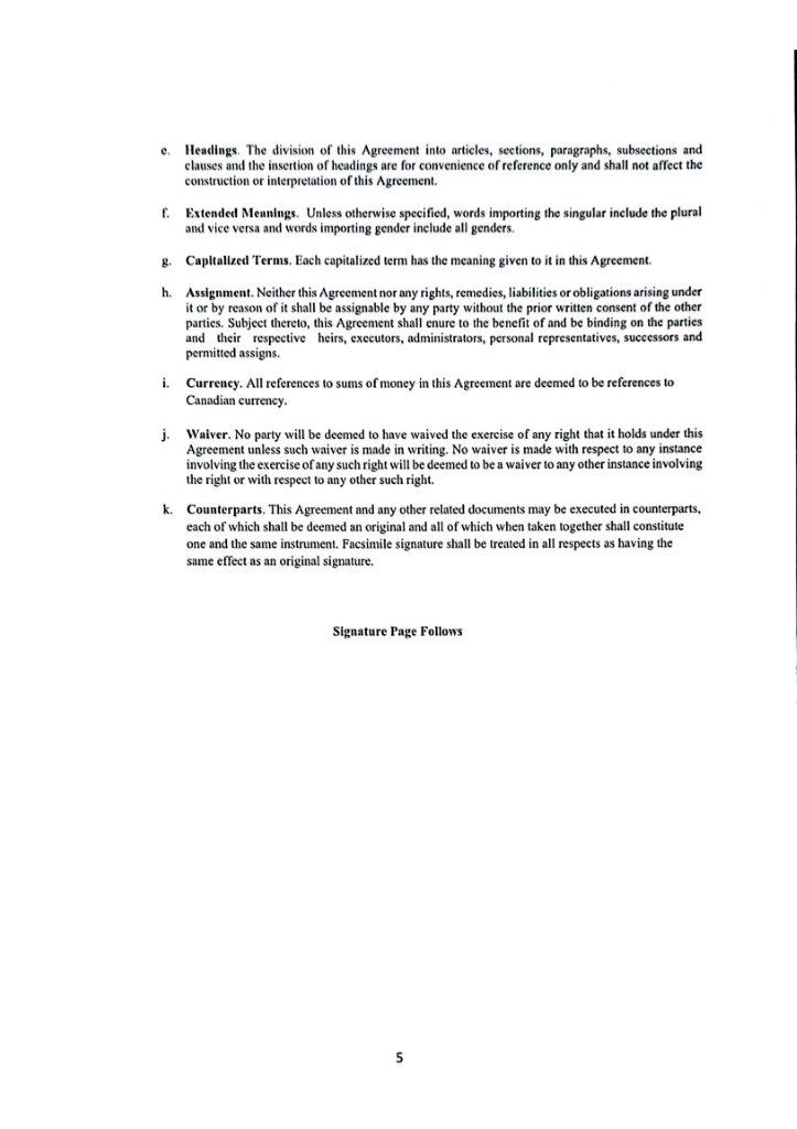 e. lle 111 lln 1 ts , The di vision of thi s Agreement into orticlcs, sec tion s, paragraph s, s ubs ec tions and cluuscs 11 ml the insertion of heudings nrc for convenience of referen ce only and s h a ll n o t affect the c on s tni ction or interpretation of thi s A gree ment . f. Extended l \ le 1111 ln 1 t s , Unless otherwise s pecified , words i mporting th e si n g ul ar include the plur a l nm! vice versa and words importing gender include all genders . g. Cu11lt11ll1.cd Terms . Each cap itali ze d term ha s the meaning given to it in this Agreement. h. Assignment . Neither thi s Agreement nor any right s, remedie s, li ab ilities or obligations arising under it or by rea son of it sha ll be assignab le by any party without the prior written consent of the other parties . Subject theret o, thi s A g reement shall cnurc to the benefit o f and be binding on the parti es and their respective heir s, executors, administrators, per so n a l repre se ntative s, successors and permitted assigns . i. Currency. All refe rence s to sums of m o ney in thi s Agreement are deemed to be reference s to Canadian c urren cy . j. Wuiver . No party will be deemed to h av e waived the exerci se of any right that it holds under this Agreement unles s s uch waiver is m ade in writing . No waiver is m ade with respect t o any in sta nce invol vin g th e exercise of anysuch right will be deemed t o b e o waiver to any other in sta nce invo lving the right or with re spect to any other s uch right . k. Counterparts. Thi s Agr eeme nt 11nd any other r e lated d oc ument s may be executed in counterparts, each of w hich s hall be deemed nn o rigin a l nnd 1111 of which when tak e n together sha ll constitute one and the some in s trnm en t. Facsimile signature s hall be treated in all re spects as ha vi ng th e sa me effect ns nn original s ign a ture . Signnturc Page Follows s