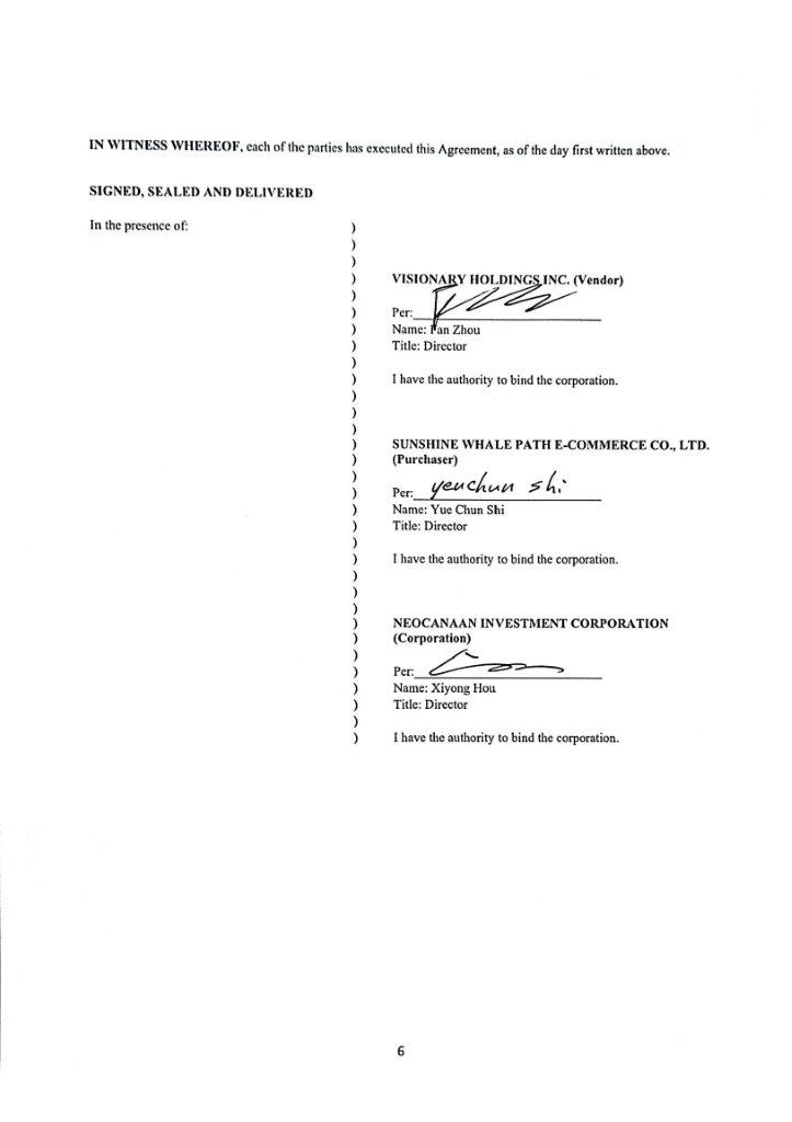 IN WITNESS WHEREOF , ea c h of the partie s ha s executed thi s Agreement , a s of the d a y fir s t written abov e. SIGNED, SEALED AND DELIVERED In the pre s ence of : VISIONA Y Vendor) Per : _ - n - --------- - I have the authority to bind the corpor a tion . ) ) ) ) ) ) ) ) ) ) ) ) ) ) SUNSHINE WHALE PATH E - COMMERCE CO. , LTD. ) (Purchaser) ) ) Per: '/e!Acl,.CAvt :> '' ) Nam e : Yue Chun Shi ) Title: Director ) ) ) ) ) ) ) ) ) ) ) ) ) I have the authority to bind the corp ora tion . NEOCANAAN INVESTMENT CORPORATION (Corporation) Per: Name: Xiyong Hou Title : Director I have th e authority to bind the corpor a tion . 6 Lizhi Chen 2024 - 12 - 27 06:03:39 ------------------------------------------- - /s/ Fan Zhou Lizhi Chen 2024 - 12 - 27 06:03:58 ------------------------------------------- - /s/ Yue Chun Shi Lizhi Chen 2024 - 12 - 27 06:04:28 ------------------------------------------- - /s/ Xiyong Hou