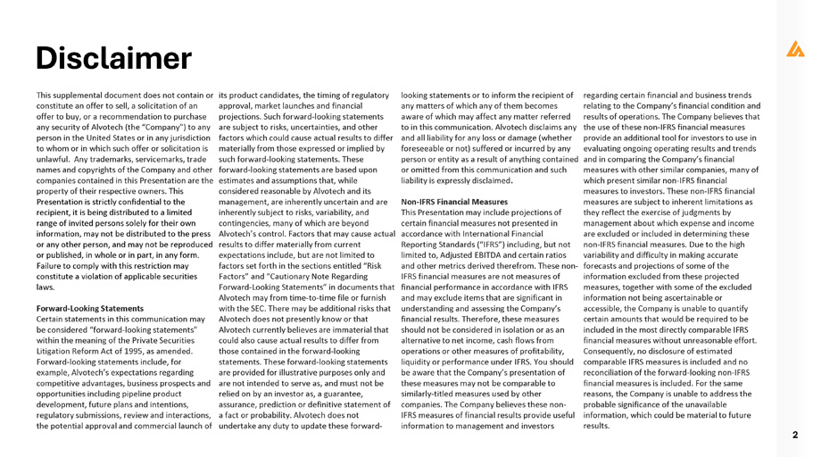 Disclaimer 2 constitute an offer to sell, a solicitation of an offer to buy, or a recommendation to purchase any security of Alvotech (the “Company”) to any person in the United States or in any jurisdiction to whom or in which such offer or solicitation is unlawful. Any trademarks, servicemarks, trade names and copyrights of the Company and other property of their respective owners. This Presentation is strictly confidential to the recipient, it is being distributed to a limited range of invited persons solely for their own information, may not be distributed to the press or published, in whole or in part, in any form. Failure to comply with this restriction may constitute a violation of applicable securities laws. This supplemental document does not contain or its product candidates, the timing of regulatory Forward - Looking Statements Certain statements in this communication may be considered “forward - looking statements” within the meaning of the Private Securities Litigation Reform Act of 1995, as amended. Forward - looking statements include, for example, Alvotech’s expectations regarding competitive advantages, business prospects and opportunities including pipeline product development, future plans and intentions, regulatory submissions, review and interactions, the potential approval and commercial launch of approval, market launches and financial projections. Such forward - looking statements are subject to risks, uncertainties, and other factors which could cause actual results to differ materially from those expressed or implied by such forward - looking statements. These forward - looking statements are based upon companies contained in this Presentation are the estimates and assumptions that, while considered reasonable by Alvotech and its management, are inherently uncertain and are inherently subject to risks, variability, and contingencies, many of which are beyond or any other person, and may not be reproduced results to differ materially from current expectations include, but are not limited to factors set forth in the sections entitled “Risk Factors” and “Cautionary Note Regarding Forward - Looking Statements” in documents that Alvotech may from time - to - time file or furnish with the SEC. There may be additional risks that Alvotech does not presently know or that Alvotech currently believes are immaterial that could also cause actual results to differ from those contained in the forward - looking statements. These forward - looking statements are provided for illustrative purposes only and are not intended to serve as, and must not be relied on by an investor as, a guarantee, assurance, prediction or definitive statement of a fact or probability. Alvotech does not undertake any duty to update these forward - looking statements or to inform the recipient of any matters of which any of them becomes aware of which may affect any matter referred to in this communication. Alvotech disclaims any and all liability for any loss or damage (whether foreseeable or not) suffered or incurred by any or omitted from this communication and such liability is expressly disclaimed . Non - IFRS Financial Measures This Presentation may include projections of certain financial measures not presented in Alvotech’s control. Factors that may cause actual accordance with International Financial Reporting Standards (“IFRS”) including, but not limited to, Adjusted EBITDA and certain ratios IFRS financial measures are not measures of financial performance in accordance with IFRS and may exclude items that are significant in understanding and assessing the Company’s financial results. Therefore, these measures should not be considered in isolation or as an alternative to net income, cash flows from operations or other measures of profitability, liquidity or performance under IFRS. You should be aware that the Company’s presentation of these measures may not be comparable to similarly - titled measures used by other companies. The Company believes these non - IFRS measures of financial results provide useful information to management and investors regarding certain financial and business trends relating to the Company’s financial condition and results of operations. The Company believes that the use of these non - IFRS financial measures provide an additional tool for investors to use in evaluating ongoing operating results and trends person or entity as a result of anything contained and in comparing the Company’s financial measures with other similar companies, many of which present similar non - IFRS financial measures to investors. These non - IFRS financial measures are subject to inherent limitations as they reflect the exercise of judgments by management about which expense and income are excluded or included in determining these non - IFRS financial measures. Due to the high variability and difficulty in making accurate and other metrics derived therefrom. These non - forecasts and projections of some of the information excluded from these projected measures, together with some of the excluded information not being ascertainable or accessible, the Company is unable to quantify certain amounts that would be required to be included in the most directly comparable IFRS financial measures without unreasonable effort. Consequently, no disclosure of estimated comparable IFRS measures is included and no reconciliation of the forward - looking non - IFRS financial measures is included. For the same reasons, the Company is unable to address the probable significance of the unavailable information, which could be material to future results.