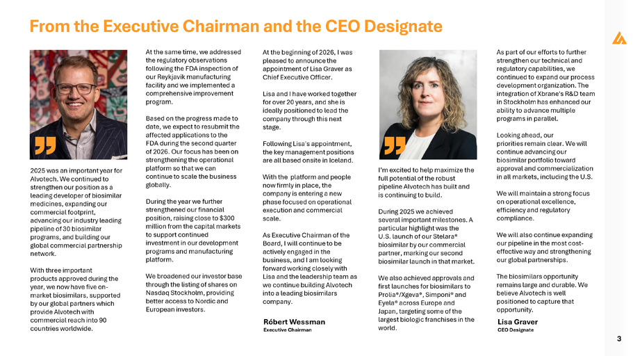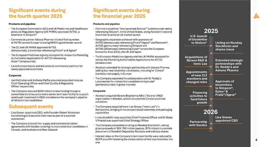 3 The biosimilars opportunity remains large and durable. We believe Alvotech is well positioned to capture that opportunity. Lisa Graver CEO Designate Róbert Wessman Executive Chairman I’m excited to help maximize the full potential of the robust pipeline Alvotech has built and is continuing to build. During 2025 we achieved several important milestones. A particular highlight was the U.S. launch of our Stelara® biosimilar by our commercial partner, marking our second biosimilar launch in that market. We also achieved approvals and first launches for biosimilars to Prolia®/Xgeva®, Simponi® and Eyela® across Europe and Japan, targeting some of the largest biologic franchises in the world. 2025 was an important year for Alvotech. We continued to strengthen our position as a leading developer of biosimilar medicines, expanding our commercial footprint, advancing our industry leading pipeline of 30 biosimilar programs, and building our global commercial partnership network. With three important products approved during the year, we now have five on - market biosimilars, supported by our global partners which provide Alvotech with commercial reach into 90 countries worldwide. At the same time, we addressed the regulatory observations following the FDA inspection of our Reykjavik manufacturing facility and we implemented a comprehensive improvement program. Based on the progress made to date, we expect to resubmit the affected applications to the FDA during the second quarter of 2026. Our focus has been on strengthening the operational platform so that we can continue to scale the business globally. During the year we further strengthened our financial position, raising close to $300 million from the capital markets to support continued investment in our development programs and manufacturing platform. We broadened our investor base through the listing of shares on Nasdaq Stockholm, providing better access to Nordic and European investors. At the beginning of 2026, I was pleased to announce the appointment of Lisa Graver as Chief Executive Officer. Lisa and I have worked together for over 20 years, and she is ideally positioned to lead the company through this next stage. Following Lisa's appointment, the key management positions are all based onsite in Iceland. With the platform and people now firmly in place, the company is entering a new phase focused on operational execution and commercial scale. As Executive Chairman of the Board, I will continue to be actively engaged in the business, and I am looking forward working closely with Lisa and the leadership team as we continue building Alvotech into a leading biosimilars company. As part of our efforts to further strengthen our technical and regulatory capabilities, we continued to expand our process development organization. The integration of Xbrane's R&D team in Stockholm has enhanced our ability to advance multiple programs in parallel. Looking ahead, our priorities remain clear. We will continue advancing our biosimilar portfolio toward approval and commercialization in all markets, including the U.S. We will maintain a strong focus on operational excellence, efficiency and regulatory compliance. We will also continue expanding our pipeline in the most cost - effective way and strengthening our global partnerships. From the Executive Chairman and the CEO Designate
