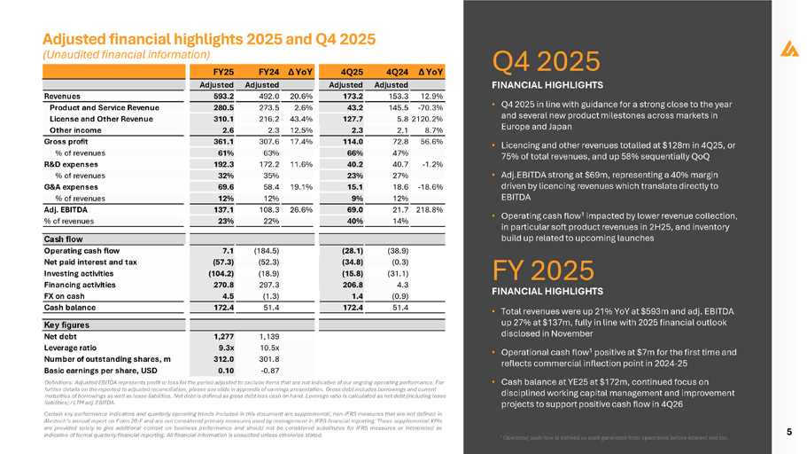 4 Significant events during the fourth quarter 2025 Products and pipeline • The European Commission (EC) and UK Medicines and Healthcare products Regulatory Agency (UK MHRA) approved AVT05, a biosimilar to Simponi® • Commercial partner Advanz Pharma initiated first launches of AVT05 across Europe following NHS England tender award • The EC and UK MHRA approved AVT03 (denosumab), a biosimilar referencing Prolia® and Xgeva® • The European Medicines Agency accepted for review the Marketing Authorization Application for AVT23 referencing Xolair® (omalizumab) • Launch preparations and deliveries to commercial partners for newly approved biosimilars Corporate • Joe McClellan and Anthony Maffia assumed expanded roles as Chief Operating Officer and Chief Quality & Regulatory Officer respectively • The Company secured $208 million in new funding through a convertible bond issuance and a senior term loan facility to support continued investment in R&D and advance the company’s pipeline of 30 biosimilar candidates Subsequent events • Lisa Graver appointed CEO, with Founder Róbert Wessman transitioning to Executive Chairman as part of a planned succession • The Company entered into supply and commercialization agreements with Sandoz covering multiple biosimilar candidates in Canada, and Australia and New Zealand Significant events during the financial year 2025 Products and pipeline • Commercial partner Teva launched Selarsdi (ustekinumab - aekn), referencing Stelara®, in the United States, being Alvotech’s second biosimilar to achieve US market launch • Geographic expansion achieved with approvals of AVT03 (denosumab) referencing Prolia®/Xgeva® and Ranmark®, AVT05 (golimumab) referencing Simponi and AVT06 (aflibercept) referencing Eylea® across the European Economic Area (EEA), the UK and Japan • The European Medicines Agency and the UK MHRA accepted for review the Marketing Authorization Applications for AVT23 (omalizumab) • Alvotech extended its strategic partnership with Advanz Pharma, adding four new biosimilar candidates, including for Cimzia® (certolizumab pegol), in Europe • The Company expanded its collaboration with Dr Reddy’s Laboratories for a biosimilar candidate to Keytruda® (pembrolizumab) in global markets Corporate • Alvotech acquired Xbrane Biopharma AB's ("Xbrane") R&D organization in Sweden, which included the Cimzia biosimilar candidate • The Company acquired Ivers - Lee Group (“Ivers - Lee”) in Switzerland, bringing in house specialized assembly and packaging capabilities • Linda Jónsdóttir was appointed Chief Financial Officer and Dr Balaji V Prasad was appointed Chief Strategy Officer • The Company completed a listing on Nasdaq Stockholm, raising gross proceeds of SEK 789 million (approx. $79 million) in a private placement of Swedish Depositary Receipts and ordinary shares • Interest rates on the Company’s term loan facility were reduced to SOFR plus 6% following the consolidation of two loan tranches into one 2025 Lisa Graver appointed CEO Financing activities to fund future growth U.S. launch of biosimilar to Stelara® Appointments of new CLT members and changed roles Listing on Nasdaq Stockholm and shares issue Acquisitions of Xbrane R&D & Ivers - Lee Extended strategic partnerships with Dr. Reddy’s and Advanz Pharma Approvals of biosimilars to Simponi®, Eylea® & Prolia®/Xgeva® 2026 Partnership with Sandoz