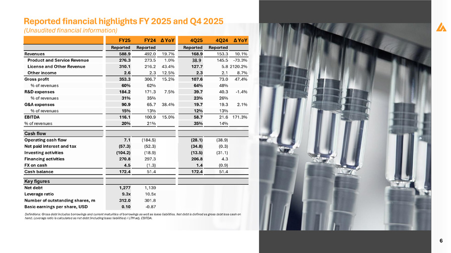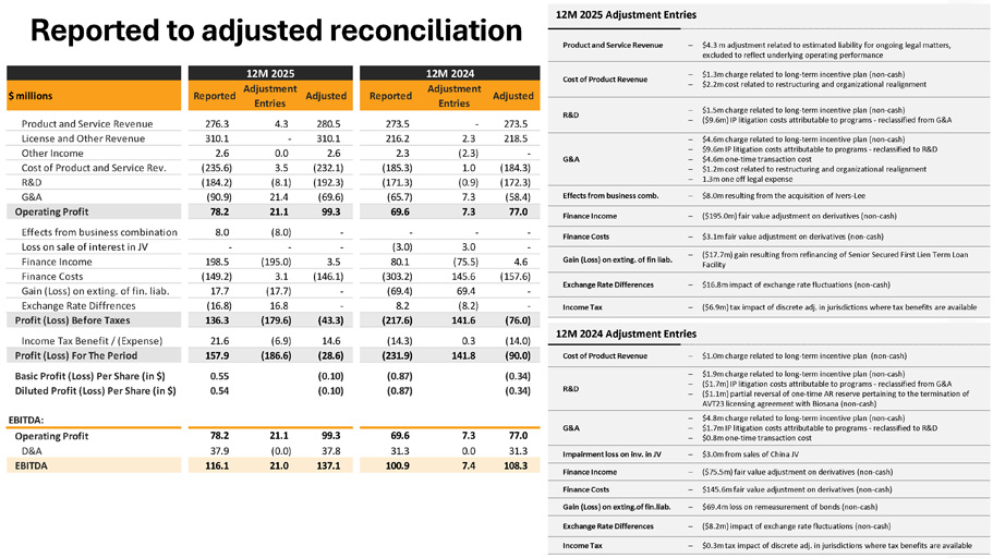 Reported to adjusted reconciliation 12M 2025 Adjustment Entries Product and Service Revenue  $4.3 m adjustment related to estimated liability for ongoing legal matters, excluded to reflect underlying operating performance $1.3m charge related to long - term incentive plan (non - cash) $2.2m cost related to restructuring and organizational realignment $1.5m charge related to long - term incentive plan (non - cash) ($9.6m) IP litigation costs attributable to programs - reclassified from G&A $4.6m charge related to long - term incentive plan (non - cash) $9.6m IP litigation costs attributable to programs - reclassified to R&D $4.6m one - time transaction cost $1.2m cost related to restructuring and organizational realignment 1.3m one off legal expense $8.0m resulting from the acquisition of Ivers - Lee Finance Income  ($195.0m) fair value adjustment on derivatives (non - cash) Finance Costs  $3.1m fair value adjustment on derivatives (non - cash) Gain (Loss) on exting. of fin liab.  ($17.7m) gain resulting from refinancing of Senior Secured First Lien Term Loan Facility Exchange Rate Differences  $16.8m impact of exchange rate fluctuations (non - cash) ($6.9m) tax impact of discrete adj. in jurisdictions where tax benefits are available Income Tax  12M 2024 Adjustment Entries Cost of Product Revenue  $1.0m charge related to long - term incentive plan (non - cash) R&D  $1.9m charge related to long - term incentive plan (non - cash)  ($1.7m) IP litigation costs attributable to programs - reclassified from G&A  ($1.1m) partial reversal of one - time AR reserve pertaining to the termination of AVT23 licensing agreement with Biosana (non - cash) G&A  $4.8m charge related to long - term incentive plan (non - cash)  $1.7m IP litigation costs attributable to programs - reclassified to R&D  $0.8m one - time transaction cost Impairment loss on inv. in JV  $3.0m from sales of China JV Finance Income  ($75.5m) fair value adjustment on derivatives (non - cash) Finance Costs  $145.6m fair value adjustment on derivatives (non - cash) Gain (Loss) on exting.of fin.liab.  $69.4m loss on remeasurement of bonds (non - cash) Exchange Rate Differences  ($8.2m) impact of exchange rate fluctuations (non - cash) Income Tax  $0.3m tax impact of discrete adj. in jurisdictions where tax benefits are available  Cost of Product Revenue   R&D  Adjusted 273.5 12M 2024 Adjustment Entries - Reported 273.5 Adjusted 280.5 12M 2025 Adjustment Entries 4.3 Reported 276.3 $ millions Product and Service Revenue  218.5 2.3 216.2 310.1 - 310.1 License and Other Revenue   G&A - (2.3) 2.3 2.6 0.0 2.6 Other Income  (184.3) 1.0 (185.3) (232.1) 3.5 (235.6) Cost of Product and Service Rev.  (172.3) (0.9) (171.3) (192.3) (8.1) (184.2) R&D  Effects from business comb. (58.4) 7.3 (65.7) (69.6) 21.4 (90.9) G&A Operating Profit 78.2 21.1 99.3 69.6 7.3 77.0 Effects from business combination 8.0 (8.0) - - - - Loss on sale of interest in JV - - - (3.0) 3.0 - Finance Income 198.5 (195.0) 3.5 80.1 (75.5) 4.6 Finance Costs (149.2) 3.1 (146.1) (303.2) 145.6 (157.6) Gain (Loss) on exting. of fin. liab. 17.7 (17.7) - (69.4) 69.4 - Exchange Rate Diffrences (16.8) 16.8 - 8.2 (8.2) - Profit (Loss) Before Taxes 136.3 (179.6) (43.3) (217.6) 141.6 (76.0) Income Tax Benefit / (Expense) 21.6 (6.9) 14.6 (14.3) 0.3 (14.0) Profit (Loss) For The Period 157.9 (186.6) (28.6) (231.9) 141.8 (90.0) Basic Profit (Loss) Per Share (in $) Diluted Profit (Loss) Per Share (in $) 0.55 0.54 (0.10) (0.10) (0.87) (0.87) (0.34) (0.34) EBITDA: Operating Profit D&A 78.2 37.9 21.1 (0.0) 99.3 37.8 69.6 31.3 7.3 0.0 77.0 31.3 EBITDA 116.1 21.0 137.1 100.9 7.4 108.3