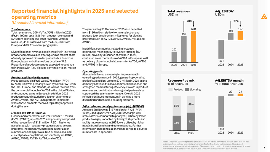 7 Total revenues: Total revenues up 20% YoY at $589 million in 2025 (FY24: 492m), split 48% from product revenues and 52% from licencing and other revenues. Of total revenues, 41% is derived from the U.S., 53% from Europe and 6% from other geographies. Diversification of revenue base increasing in line with a broader commercialized offering, and as market share of newly approved biosimilar products builds across Europe, Japan and other regions outside of U.S. Proportion of product revenues expected to continue to increase with R&D pipeline conversion to on - market products. Product and Service Revenue: Product revenue in FY25 was $276 million (FY24: $274m). This was primarily driven by sales of AVT02 in the U.S., Europe, and Canada, as well as revenue from the commercial launch of AVT04 in the United States, and continued sales in Europe. In addition, 2025 product revenue included pre - launch shipments of AVT03, AVT05, and AVT06 to partners in markets where these products received regulatory approvals during the year. License and Other Revenue: License and other revenue in FY25 was $310 million (FY24: $216m), up 43% YoY, and primarily composed of the recognition of $121 million R&D milestones associated with regulatory progress across several programs, including EMA marketing authorization submissions and approvals, CTA submissions, and clinical phase completions, most notably for AVT03, AVT05, AVT06, AVT10, AVT16, and AVT23. The year ending 31 December 2025 also benefited from $126 million relative to clone selection and process - lock development milestones for pipeline programs such as AVT28, AVT33, AVT41, AVT48 and AVT65. In addition, commercial - related milestones contributed meaningfully to revenue totalling $50 million, driven by US launch of AVT04 in 1Q25, continued sales momentum of AVT04 in Europe as well as delivery of pre - launch shipments for AVT06, AVT05 and AVT03 in Europe. Operating profit: Alvotech delivered a meaningful improvement in operating performance in 2025, generating operating profit of $78 million, up from $70 million in 2024 as the company continued to scale commercial launches and strengthen manufacturing efficiency. Growth in product revenues and contributions from global partnerships supported the year’s performance . Overall, 2025 reflects continued momentum in building a more diversified and scalable operating platform . Adjusted operational performance (Adj. EBITDA 1 ) Adjusted EBITDA was $137 million for FY25 (FY24: 108m), and up 27% YoY. Adj. EBITDA margin was stable at 23% compared to prior year, whereby lower product margin, impacted by timing of shipments and facility improvements in 2H25, were offset by higher margin from licencing and other revenues. Further information on reconciliation from reported to adjusted numbers are in appendix. Reported financial highlights in 2025 and selected operating metrics 202 492 589 2023 2024 2025 Total revenues USD m +20% 108 137 - 291 2023 2024 2025 Adj. EBITDA 1 USD m +27% - 312 2023 2024 2025 44% 52% 56% 48% 2024 2025 Product Licensing Revenues 2 by mix % of revenues Adj.EBITDA margin % of total revenues 22 23 Notes: 1 Adjusted EBITDA represents profit or loss for the period adjusted to exclude items that are not indicative of our ongoing operating performance. For further details on the reported to adjusted reconciliation, please see slide in appendix. 2 Revenues reflect product & service revenues and licensing and other revenue, other income not included. Total revenues also include other income. (Unaudited financial information)