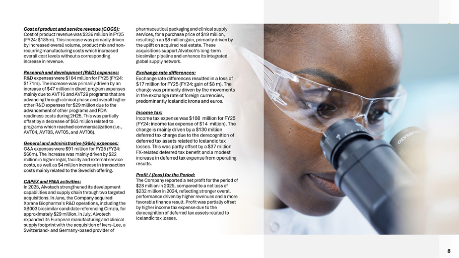 8 Cost of product and service revenue (COGS): Cost of product revenue was $236 million in FY25 (FY24: $185m). This increase was primarily driven by increased overall volume, product mix and non - recurring manufacturing costs which increased overall cost levels without a corresponding increase in revenue. Research and development (R&D) expenses: R&D expenses were $184 million for FY25 (FY24: $171m). The increase was primarily driven by an increase of $47 million in direct program expenses mainly due to AVT16 and AVT29 programs that are advancing through clinical phase and overall higher other R&D expenses for $29 million due to the advancement of other programs and FDA readiness costs during 2H25. This was partially offset by a decrease of $63 million related to programs which reached commercialization (i.e., AVT04, AVT03, AVT05, and AVT06). General and administrative (G&A) expenses: G&A expenses were $91 million for FY25 (FY24: $66m). The increase was mainly driven by $22 million in higher legal, facility and external service costs, as well as $4 million increase in transaction costs mainly related to the Swedish offering. CAPEX and M&A activities: In 2025, Alvotech strengthened its development capabilities and supply chain through two targeted acquisitions. In June, the Company acquired Xbrane Biopharma’s R&D operations, including the XB003 biosimilar candidate referencing Cimzia, for approximately $29 million. In July, Alvotech expanded its European manufacturing and clinical supply footprint with the acquisition of Ivers - Lee, a Switzerland - and Germany - based provider of pharmaceutical packaging and clinical supply services, for a purchase price of $19 million, resulting in an $8 million gain, primarily driven by the uplift on acquired real estate. These acquisitions support Alvotech’s long - term biosimilar pipeline and enhance its integrated global supply network. Exchange rate differences: Exchange rate differences resulted in a loss of $17 million for FY25 (FY24: gain of $8 m). The change was primarily driven by the movements in the exchange rate of foreign currencies, predominantly Icelandic krona and euros. Income tax: Income tax expense was $108 million for FY25 (FY24: income tax expense of $14 million). The change is mainly driven by a $130 million deferred tax charge due to the derecognition of deferred tax assets related to Icelandic tax losses. This was partly offset by a $37 million FX - related deferred tax benefit and a modest increase in deferred tax expense from operating results. Profit / (loss) for the Period: The Company reported a net profit for the period of $28 million in 2025, compared to a net loss of $232 million in 2024, reflecting stronger overall performance driven by higher revenues and a more favorable finance result. Profit was partially offset by higher income tax expense due to the derecognition of deferred tax assets related to Icelandic tax losses.