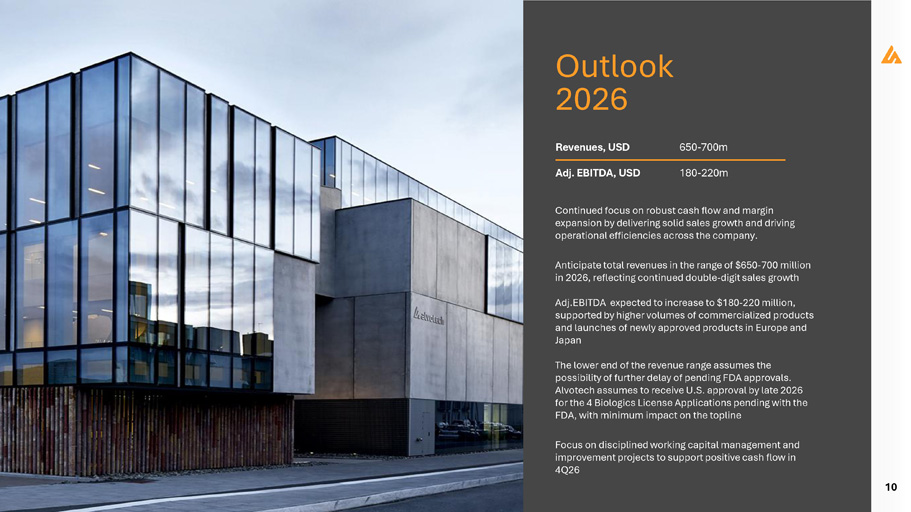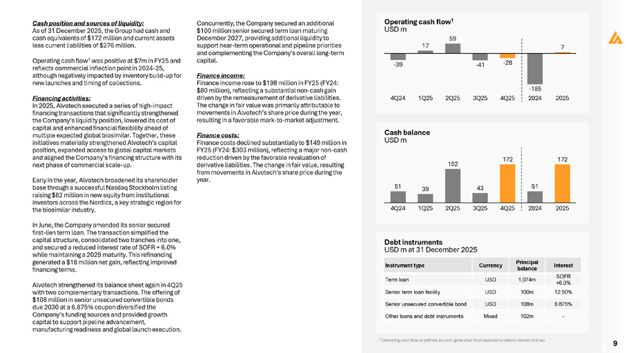 9 Cash position and sources of liquidity: As of 31 December 2025, the Group had cash and cash equivalents of $172 million and current assets less current liabilities of $276 million. Operating cash flow 1 was positive at $7m in FY25 and reflects commercial inflection point in 2024 - 25, although negatively impacted by inventory build - up for new launches and timing of collections. Financing activities: In 2025, Alvotech executed a series of high - impact financing transactions that significantly strengthened the Company’s liquidity position, lowered its cost of capital and enhanced financial flexibility ahead of multiple expected global biosimilar. Together, these initiatives materially strengthened Alvotech’s capital position, expanded access to global capital markets and aligned the Company’s financing structure with its next phase of commercial scale - up. Early in the year, Alvotech broadened its shareholder base through a successful Nasdaq Stockholm listing raising $82 million in new equity from institutional investors across the Nordics, a key strategic region for the biosimilar industry. In June, the Company amended its senior secured first - lien term loan. The transaction simplified the capital structure, consolidated two tranches into one, and secured a reduced interest rate of SOFR + 6.0% while maintaining a 2029 maturity. This refinancing generated a $18 million net gain, reflecting improved financing terms. Alvotech strengthened its balance sheet again in 4Q25 with two complementary transactions. The offering of $108 million in senior unsecured convertible bonds due 2030 at a 6.875% coupon diversified the Company’s funding sources and provided growth capital to support pipeline advancement, manufacturing readiness and global launch execution. Concurrently, the Company secured an additional $100 million senior secured term loan maturing December 2027, providing additional liquidity to support near - term operational and pipeline priorities and complementing the Company’s overall long - term capital. Finance income: Finance income rose to $198 million in FY25 (FY24: $80 million), reflecting a substantial non - cash gain driven by the remeasurement of derivative liabilities. The change in fair value was primarily attributable to movements in Alvotech’s share price during the year, resulting in a favorable mark - to - market adjustment. Finance costs: Finance costs declined substantially to $149 million in FY25 (FY24: $303 million), reflecting a major non - cash reduction driven by the favorable revaluation of derivative liabilities. The change in fair value, resulting from movements in Alvotech’s share price during the year. Cash balance USD m Debt instruments USD m at 31 December 2025 - 39 Operating cash flow 1 USD m 59 17 - 41 - 28 7 - 185 4Q24 1Q25 2Q25 3Q25 4Q25 2024 2025 51 39 152 43 172 51 172 4Q24 1Q25 2Q25 3Q25 4Q25 2024 2025 Interest Principal balance Currency Instrument type SOFR +6.0% 1,074m USD Term loan 12.50% 100m USD Senior term loan facility 6.875% 108m USD Senior unsecured convertible bond - 102m Mixed Other loans and debt instruments 1 Operating cash flow is defined as cash generated from operations before interest and tax.