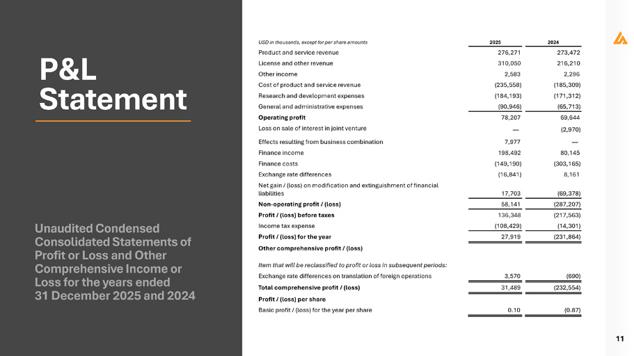 Unaudited Condensed Consolidated Statements of Profit or Loss and Other Comprehensive Income or Loss for the years ended 31 December 2025 and 2024 11 P&L Statement 2024 2025 USD in thousands, except for per share amounts 273,472 276,271 Product and service revenue 216,210 310,050 License and other revenue 2,296 2,583 Other income (185,309) (235,558) Cost of product and service revenue (171,312) (184,193) Research and development expenses (65,713) (90,946) General and administrative expenses 69,644 78,207 Operating profit (2,970) — Loss on sale of interest in joint venture — 7,977 Effects resulting from business combination 80,145 198,492 Finance income (303,165) (149,190) Finance costs 8,161 (16,841) Exchange rate differences (69,378) 17,703 Net gain / (loss) on modification and extinguishment of financial liabilities (287,207) 58,141 Non - operating profit / (loss) (217,563) 136,348 Profit / (loss) before taxes (14,301) (108,429) Income tax expense (231,864) 27,919 Profit / (loss) for the year Other comprehensive profit / (loss) Item that will be reclassified to profit or loss in subsequent periods: (690) 3,570 Exchange rate differences on translation of foreign operations (232,554) 31,489 Total comprehensive profit / (loss) Profit / (loss) per share (0.87) 0.10 Basic profit / (loss) for the year per share