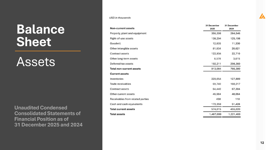 Unaudited Condensed Consolidated Statements of Financial Position as of 31 December 2025 and 2024 12 Balance Sheet Assets USD in thousands Non - current assets 31 December 2025 31 December 2024 284,546 356,398 Property, plant and equipment 125,198 138,294 Right - of - use assets 11,330 12,835 Goodwill 20,621 81,834 Other intangible assets 22,710 122,934 Contract assets 3,615 8,578 Other long - term assets 298,360 192,211 Deferred tax assets 766,380 913,084 Total non - current assets 127,889 220,054 Current assets Inventories 160,217 69,740 Trade receivables 67,304 64,440 Contract assets 48,064 46,984 Other current assets 118 438 Receivables from related parties 51,428 172,359 Cash and cash equivalents 455,020 574,015 Total current assets 1,221,400 1,487,099 Total assets