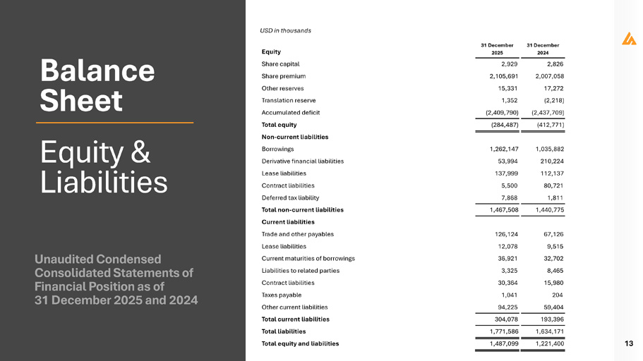 Unaudited Condensed Consolidated Statements of Financial Position as of 31 December 2025 and 2024 2,826 2,929 Share capital 2,007,058 2,105,691 Share premium 17,272 15,331 Other reserves (2,218) 1,352 Translation reserve (2,437,709) (2,409,790) Accumulated deficit (412,771) (284,487) Total equity 1,035,882 1,262,147 Non - current liabilities Borrowings 210,224 53,994 Derivative financial liabilities 112,137 137,999 Lease liabilities 80,721 5,500 Contract liabilities 1,811 7,868 Deferred tax liability 1,440,775 1,467,508 Total non - current liabilities 67,126 126,124 Current liabilities Trade and other payables 9,515 12,078 Lease liabilities 32,702 36,921 Current maturities of borrowings 8,465 3,325 Liabilities to related parties 15,980 30,364 Contract liabilities 204 1,041 Taxes payable 59,404 94,225 Other current liabilities 193,396 304,078 Total current liabilities 1,634,171 1,771,586 Total liabilities 13 1,221,400 1,487,099 Total equity and liabilities Balance Sheet Equity & Liabilities USD in thousands Equity 31 December 2025 31 December 2024