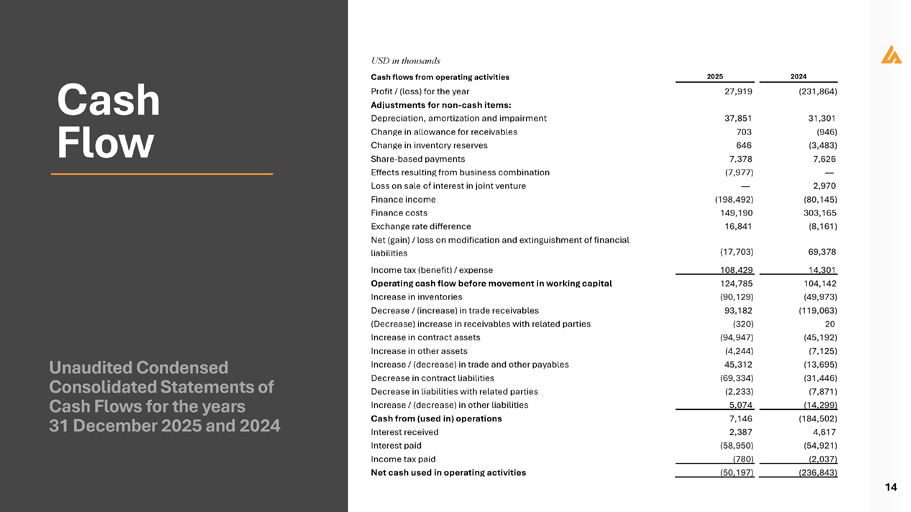Unaudited Condensed Consolidated Statements of Cash Flows for the years 31 December 2025 and 2024 14 Cash Flow USD in thousands 2024 2025 Cash flows from operating activities (231,864) 27,919 Profit / (loss) for the year Adjustments for non - cash items: 31,301 37,851 Depreciation, amortization and impairment (946) 703 Change in allowance for receivables (3,483) 646 Change in inventory reserves 7,626 7,378 Share - based payments — (7,977) Effects resulting from business combination 2,970 — Loss on sale of interest in joint venture (80,145) (198,492) Finance income 303,165 149,190 Finance costs (8,161) 16,841 Exchange rate difference 69,378 (17,703) Net (gain) / loss on modification and extinguishment of financial liabilities 14,301 108,429 Income tax (benefit) / expense 104,142 124,785 Operating cash flow before movement in working capital (49,973) (90,129) Increase in inventories (119,063) 93,182 Decrease / (increase) in trade receivables 20 (320) (Decrease) increase in receivables with related parties (45,192) (94,947) Increase in contract assets (7,125) (4,244) Increase in other assets (13,695) 45,312 Increase / (decrease) in trade and other payables (31,446) (69,334) Decrease in contract liabilities (7,871) (2,233) Decrease in liabilities with related parties (14,299) 5,074 Increase / (decrease) in other liabilities (184,502) 7,146 Cash from (used in) operations 4,617 2,387 Interest received (54,921) (58,950) Interest paid (2,037) (780) Income tax paid (236,843) (50,197) Net cash used in operating activities