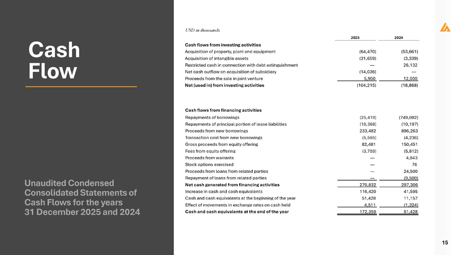 Unaudited Condensed Consolidated Statements of Cash Flows for the years 31 December 2025 and 2024 15 Cash Flow USD in thousands Cash flows from investing activities (53,661) (64,470) Acquisition of property, plant and equipment (3,339) (31,659) Acquisition of intangible assets 26,132 — Restricted cash in connection with debt extinguishment — (14,036) Net cash outflow on acquisition of subsidiary 12,000 5,950 Proceeds from the sale in joint venture (18,868) (104,215) Net (used in) from investing activities Cash flows from financing activities (749,082) (25,419) Repayments of borrowings (10,197) (10,368) Repayments of principal portion of lease liabilities 896,263 233,482 Proceeds from new borrowings (4,236) (5,585) Transaction cost from new borrowings 150,451 82,481 Gross proceeds from equity offering (5,812) (3,759) Fees from equity offering 4,843 — Proceeds from warrants 76 — Stock options exercised 24,500 — Proceeds from loans from related parties (9,500) — Repayment of loans from related parties 297,306 270,832 Net cash generated from financing activities 41,595 116,420 Increase in cash and cash equivalents 11,157 51,428 Cash and cash equivalents at the beginning of the year (1,324) 4,511 Effect of movements in exchange rates on cash held 51,428 172,359 Cash and cash equivalents at the end of the year
