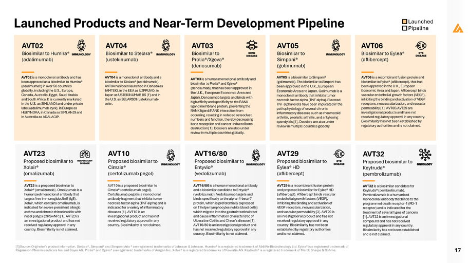 17 AVT02 Biosimilar to Humira® (adalimumab) AVT02 is a monoclonal antibody and has been approved as a biosimilar to Humira® (adalimumab) in over 50 countries globally, including the U.S., Europe, Canada, Australia, Egypt, Saudi Arabia and South Africa. It is currently marketed in the U.S. as SIMLANDI and under private label (adalimumab - ryvk), in Europe as HUKYNDRA, in Canada as SIMLANDI and in Australia as ADALACIP. AVT03 Biosimilar to Prolia®/Xgeva® (denosumab) AVT03 is a human monoclonal antibody and biosimilar to Prolia® and Xgeva® (denosumab), that has been approved in the U.K., European Economic Area and Japan . Denosumab targets and binds with high affinity and specificity to the RANK ligand membrane protein, preventing the RANK ligand/RANK interaction from occurring, resulting in reduced osteoclast numbers and function, thereby decreasing bone resorption and cancer - induced bone destruction [1]. Dossiers are also under review in multiple countries globally. AVT04 Biosimilar to Stelara® (ustekinumab) AVT04 is a monoclonal antibody and a biosimilar to Stelara® (ustekinumab). AVT04 has been launched in Canada as JAMTEKI, in the EEA as UZPRUVO, in Japan as USTEKINUMAB BS (F) and in the U.S. as SELARSDI (ustekinumab - aekn. AVT05 Biosimilar to Simponi® (golimumab) AVT05 is a biosimilar to Simponi® (golimumab). The biosimilar to Simponi has been approved in the U.K., European Economic Area and Japan. Golimumab is a monoclonal antibody that inhibits tumor necrosis factor alpha (TNF alpha). Elevated TNF alpha levels have been implicated in the pathophysiology of several chronic inflammatory diseases such as rheumatoid arthritis, psoriatic arthritis, and ankylosing spondylitis [1]. Dossiers are also under review in multiple countries globally AVT10 Proposed biosimilar to Cimzia® (certolizumab pegol) AVT10 is a proposed biosimilar to Cimzia® (certolizumab pegol). Certolizumab pegol is a monoclonal antibody fragment that inhibits tumor necrosis factor alpha (TNF alpha) and is indicated for a variety of inflammatory diseases [1]. AVT10 is an investigational product and has not received regulatory approval in any country. Biosimilarity is not claimed. AVT16/80 Proposed biosimilar to Entyvio® (vedolizumab) AVT16/80 is a human monoclonal antibody and a biosimilar candidate to Entyvio® (vedolizumab). Vedolizumab targets and binds specifically to the alpha - 4 - beta - 7 protein, which is preferentially expressed on T helper lymphocytes (white blood cells) which migrate into the gastrointestinal tract and cause inflammation characteristic of Ulcerative Colitis and Chron’s disease [ 1 ] . AVT 16 / 80 is an investigational product and has not received regulatory approval in any country . Biosimiliarity is not claimed . AVT06 Biosimilar to Eylea® (aflibercept) AVT06 is a recombinant fusion protein and biosimilar to Eylea® (aflibercept), that has been approved in the U.K., European Economic Area and Japan. Aflibercept binds vascular endothelial growth factors (VEGF), inhibiting the binding and activation of VEGF receptors, neovascularization, and vascular permeability [1]. AVT06/AVT29 are investigational products and have not received regulatory approval in any country. Biosimilarity has not been established by regulatory authorities and is not claimed. AVT23 Proposed biosimilar to Xolair® (omalizumab) AVT23 is a proposed biosimilar to Xolair® (omalizumab). Omalizumab is a humanized monoclonal antibody that targets free immunoglobulin E (IgE). Xolair, which contains omalizumab, is indicated for severe persistent allergic asthma and chronic rhinosinusitis with nasal polyps (CRSwNP) [1]. AVT23 is an investigational product and has not received regulatory approval in any country. Biosimilarity is not claimed. [1] Source: Originator’s product information. Stelara®, Simponi® and Simponi Aria ® are registered trademarks of Johnson & Johnson. Humira® is a registered trademark of AbbVie Biotechnology Ltd. Eylea® is a registered trademark of Regeneron Pharmaceuticals Inc and Bayer AG. Prolia® and Xgeva® are registered trademarks of Amgen Inc. Xolair® is a registered trademarks of Novartis AG. Keytruda® is a registered trademark of Merck Sharpe & Dohme. Launched Products and Near - Term Development Pipeline AVT29 Proposed biosimilar to Eylea® HD (aflibercept) AVT29 is a recombinant fusion protein and proposed biosimilar for Eylea® HD (aflibercept). Aflibercept binds vascular endothelial growth factors (VEGF), inhibiting the binding and activation of VEGF receptors, neovascularization, and vascular permeability [3]. AVT29 is an investigational product and has not received regulatory approval in any country. Biosimilarity has not been established by regulatory authorities and is not claimed. AVT32 Proposed biosimilar to Keytruda® (pembrolizumab) AVT32 is a biosimilar candidate for Keytruda® (pembrolizumab). Pembrolizumab is a humanized monoclonal antibody that binds to the programmed death receptor - 1 (PD - 1 receptor) and is indicated for the treatment of several types of cancers [1]. AVT32 is an investigational compound and has not received regulatory approval in any country. Biosimilarity has not been established and is not claimed. Launched Pipeline