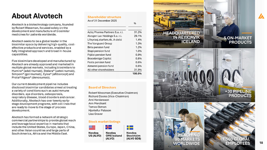 Q4 2025 Earnings Release 18 About Alvotech Alvotech is a biotechnology company, founded by Robert Wessman, focused solely on the development and manufacture of biosimilar medicines for patients worldwide. Alvotech seeks to be a global leader in the biosimilar space by delivering high - quality, cost - effective products and services, enabled by a fully integrated approach and broad in - house capabilities. Five biosimilars developed and manufactured by Alvotech are already approved and marketed in multiple global markets, including biosimilars to Humira® (adalimumab), Stelara® (ustekinumab), Simponi® (golimumab), Eylea® (aflibercept) and Prolia®/Xgeva® (denosumab). Our current development pipeline includes disclosed biosimilar candidates aimed at treating a variety of conditions such as autoimmune disorders, eye disorders, osteoporosis, respiratory disease, blood disorders and cancer. Additionally, Alvotech has over twenty early - stage development programs, with cell lines that are ready to move to the stage of process development. Alvotech has formed a network of strategic commercial partnerships to provide global reach and leverage local expertise in markets that include the United States, Europe, Japan, China, and other Asian countries and large parts of South America, Africa and the Middle East. HEADQUARTERED IN REYKJAVIK ICELAND +30 PIPELINE PRODUCTS 5 ON - MARKET PRODUCTS REACHING 90 MARKETS WORLDWIDE ~1,500 GLOBAL EMPLOYEES % 31.2% Aztiq Pharma Partners S.a. r.l. 29.1% Alvogen Lux Holdings S.a. r.l. 1.4% Lífeyrissj.starfsm.rík. A - deild 1.3% The Vanguard Group 1.2% Birta pension fund 1.0% Stapi pension fund 0.9% Frjálsi pension fund 0.8% Bracebridge Capital 0.6% Festa pension fund 0.6% Almenni pension fund 31.9% All other shareholders 100.0% Shareholder structure As of 31 December 2025 Board of Directors Robert Wessman (Executive Chairman) Richard Davies (Vice - Chairman) Arni Hardarsson Ann Merchant Tomas Ekman Hjorleifur Palsson Lisa Graver Stock market listings Nasdaq US (ALVO) Nasdaq OMX Iceland (ALVO) Nasdaq Stockholm (ALVO SDB)
