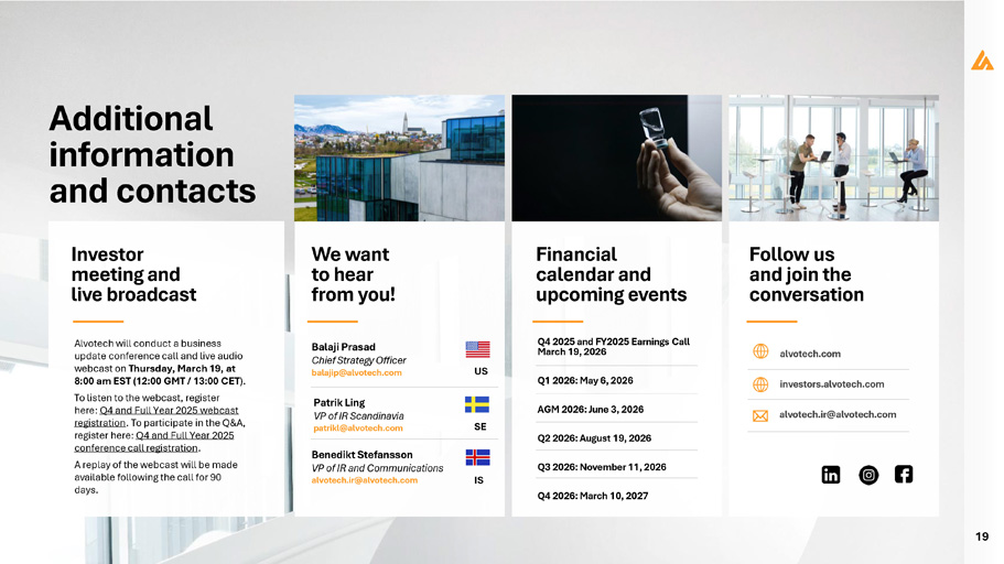 Additional information and contacts We want to hear from you! Follow us and join the conversation alvotech.com investors.alvotech.com alvotech.ir@alvotech.com Balaji Prasad Chief Strategy Officer balajip@alvotech.com Patrik Ling VP of IR Scandinavia patrikl@alvotech.com Benedikt Stefansson VP of IR and Communications alvotech.ir@alvotech.com US SE IS Financial calendar and upcoming events Q4 2025 and FY2025 Earnings Call March 19, 2026 Q1 2026: May 6, 2026 AGM 2026: June 3, 2026 Q2 2026: August 19, 2026 Q3 2026: November 11, 2026 Q4 2026: March 10, 2027 19 Investor meeting and live broadcast Alvotech will conduct a business update conference call and live audio webcast on Thursday, March 19, at 8:00 am EST (12:00 GMT / 13:00 CET ). To listen to the webcast, register here: Q4 and Full Year 2025 webcast registration . To participate in the Q&A, register here: Q4 and Full Year 2025 conference call registration . A replay of the webcast will be made available following the call for 90 days.