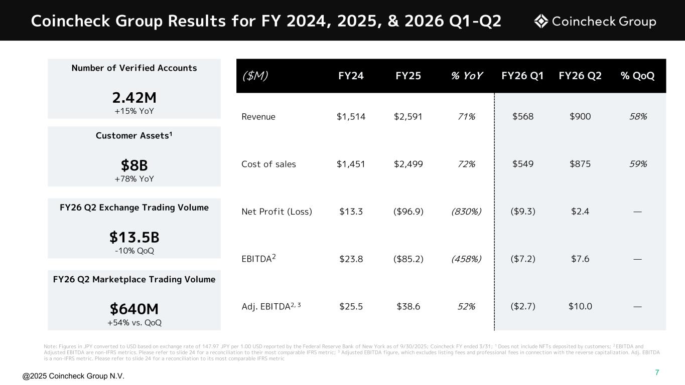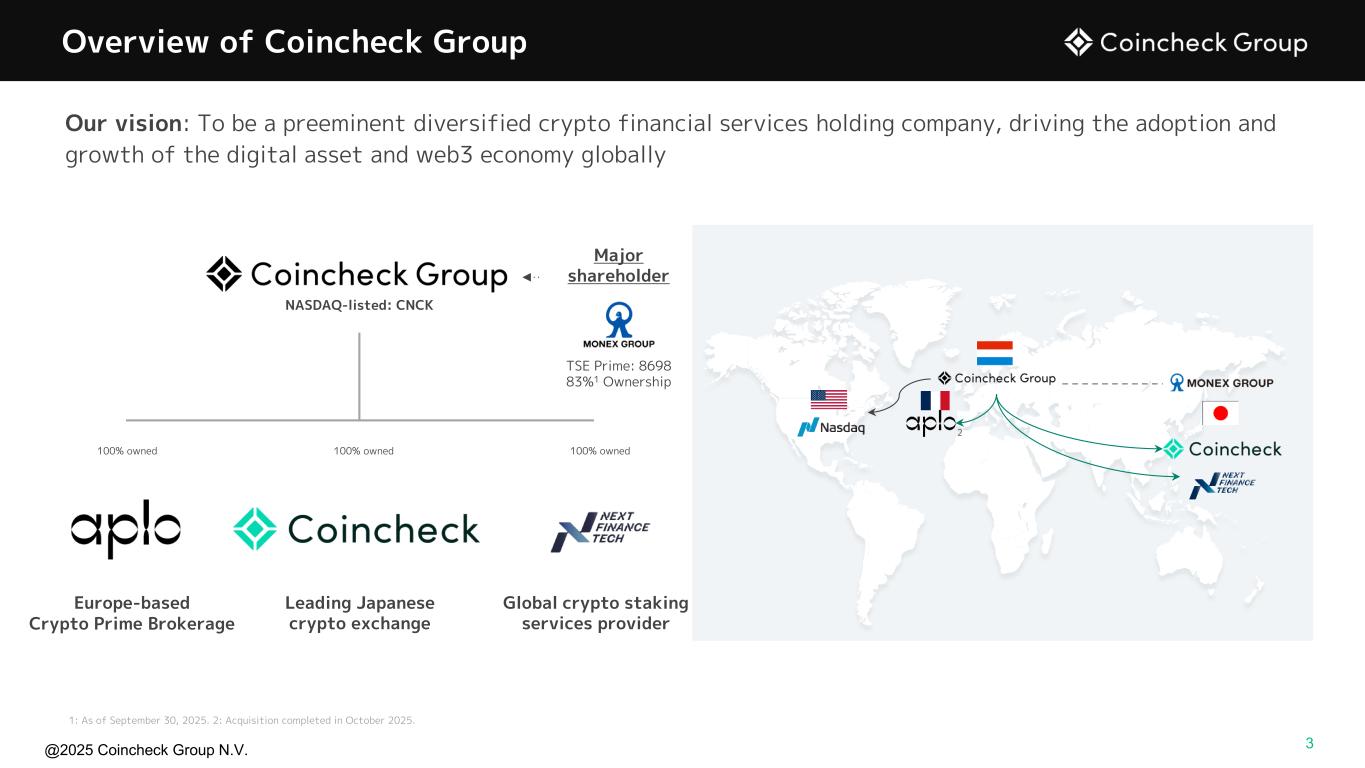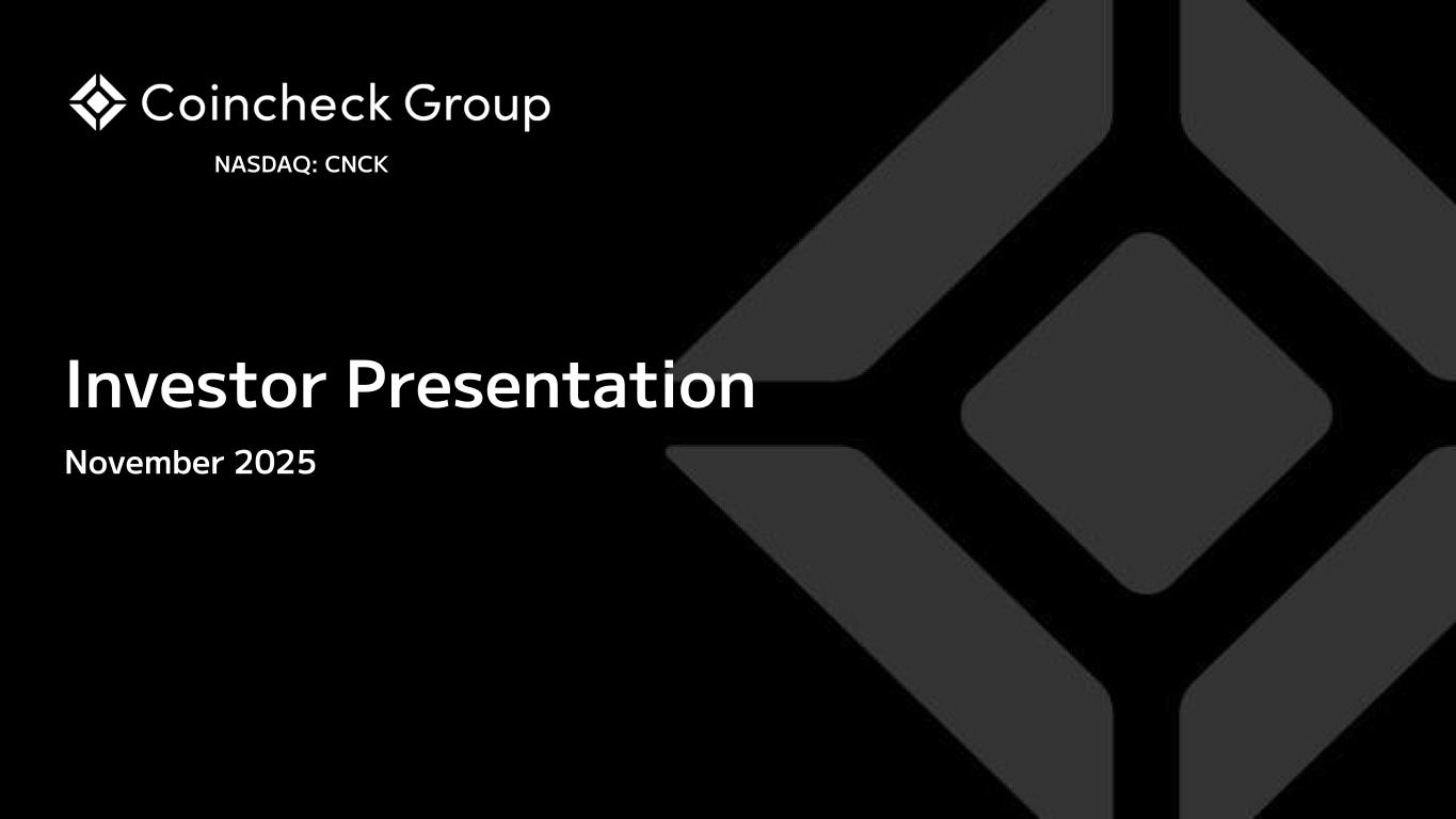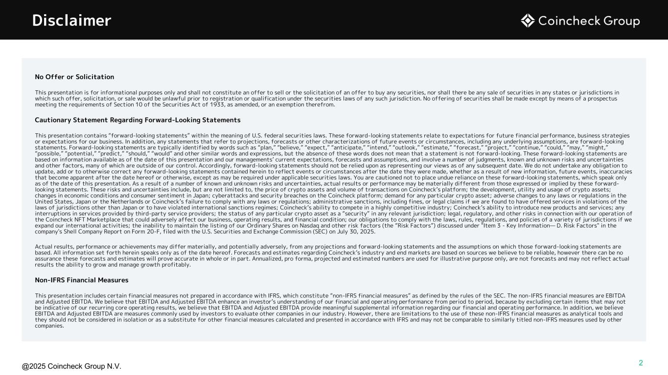 @2025 Coincheck Group N.V. No Offer or Solicitation This presentation is for informational purposes only and shall not constitute an offer to sell or the solicitation of an offer to buy any securities, nor shall there be any sale of securities in any states or jurisdictions in which such offer, solicitation, or sale would be unlawful prior to registration or qualification under the securities laws of any such jurisdiction. No offering of securities shall be made except by means of a prospectus meeting the requirements of Section 10 of the Securities Act of 1933, as amended, or an exemption therefrom. Cautionary Statement Regarding Forward-Looking Statements This presentation contains “forward-looking statements” within the meaning of U.S. federal securities laws. These forward-looking statements relate to expectations for future financial performance, business strategies or expectations for our business. In addition, any statements that refer to projections, forecasts or other characterizations of future events or circumstances, including any underlying assumptions, are forward-looking statements. Forward-looking statements are typically identified by words such as “plan,” “believe,” “expect,” “anticipate,” “intend,” “outlook,” “estimate,” “forecast,” “project,” “continue,” “could,” “may,” “might,” “possible,” “potential,” “predict,” “should,” “would” and other similar words and expressions, but the absence of these words does not mean that a statement is not forward-looking. These forward-looking statements are based on information available as of the date of this presentation and our managements’ current expectations, forecasts and assumptions, and involve a number of judgments, known and unknown risks and uncertainties and other factors, many of which are outside of our control. Accordingly, forward-looking statements should not be relied upon as representing our views as of any subsequent date. We do not undertake any obligation to update, add or to otherwise correct any forward-looking statements contained herein to reflect events or circumstances after the date they were made, whether as a result of new information, future events, inaccuracies that become apparent after the date hereof or otherwise, except as may be required under applicable securities laws. You are cautioned not to place undue reliance on these forward-looking statements, which speak only as of the date of this presentation. As a result of a number of known and unknown risks and uncertainties, actual results or performance may be materially different from those expressed or implied by these forward- looking statements. These risks and uncertainties include, but are not limited to, the price of crypto assets and volume of transactions on Coincheck’s platform; the development, utility and usage of crypto assets; changes in economic conditions and consumer sentiment in Japan; cyberattacks and security breaches on the Coincheck platform; demand for any particular crypto asset; adverse changes to any laws or regulations in the United States, Japan or the Netherlands or Coincheck’s failure to comply with any laws or regulations; administrative sanctions, including fines, or legal claims if we are found to have offered services in violations of the laws of jurisdictions other than Japan or to have violated international sanctions regimes; Coincheck’s ability to compete in a highly competitive industry; Coincheck’s ability to introduce new products and services; any interruptions in services provided by third-party service providers; the status of any particular crypto asset as a “security” in any relevant jurisdiction; legal, regulatory, and other risks in connection with our operation of the Coincheck NFT Marketplace that could adversely affect our business, operating results, and financial condition; our obligations to comply with the laws, rules, regulations, and policies of a variety of jurisdictions if we expand our international activities; the inability to maintain the listing of our Ordinary Shares on Nasdaq and other risk factors (the “Risk Factors”) discussed under "Item 3 - Key Information— D. Risk Factors" in the company's Shell Company Report on Form 20-F, filed with the U.S. Securities and Exchange Commission (SEC) on July 30, 2025. Actual results, performance or achievements may differ materially, and potentially adversely, from any projections and forward-looking statements and the assumptions on which those forward-looking statements are based. All information set forth herein speaks only as of the date hereof. Forecasts and estimates regarding Coincheck’s industry and end markets are based on sources we believe to be reliable, however there can be no assurance these forecasts and estimates will prove accurate in whole or in part. Annualized, pro forma, projected and estimated numbers are used for illustrative purpose only, are not forecasts and may not reflect actual results the ability to grow and manage growth profitably. Non-IFRS Financial Measures This presentation includes certain financial measures not prepared in accordance with IFRS, which constitute “non-IFRS financial measures” as defined by the rules of the SEC. The non-IFRS financial measures are EBITDA and Adjusted EBITDA. We believe that EBITDA and Adjusted EBITDA enhance an investor’s understanding of our financial and operating performance from period to period, because by excluding certain items that may not be indicative of our recurring core operating results, we believe that EBITDA and Adjusted EBITDA provide meaningful supplemental information regarding our financial and operating performance. In addition, we believe EBITDA and Adjusted EBITDA are measures commonly used by investors to evaluate other companies in our industry. However, there are limitations to the use of these non-IFRS financial measures as analytical tools and th