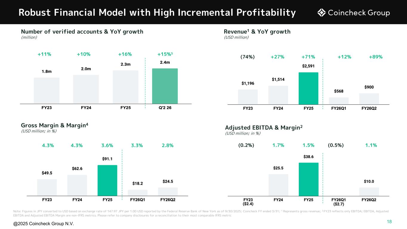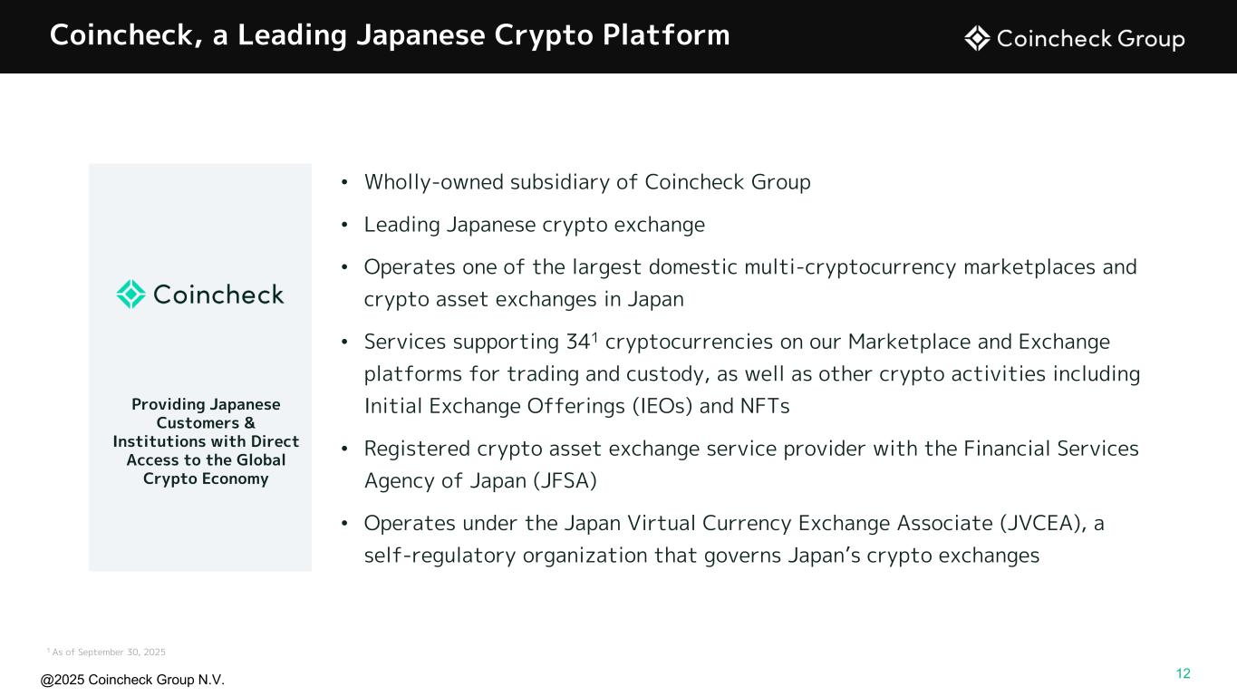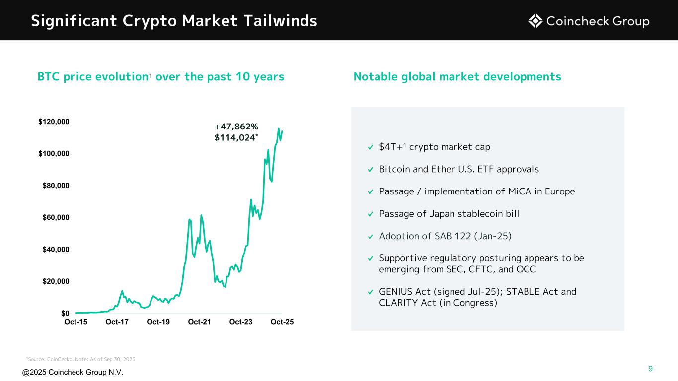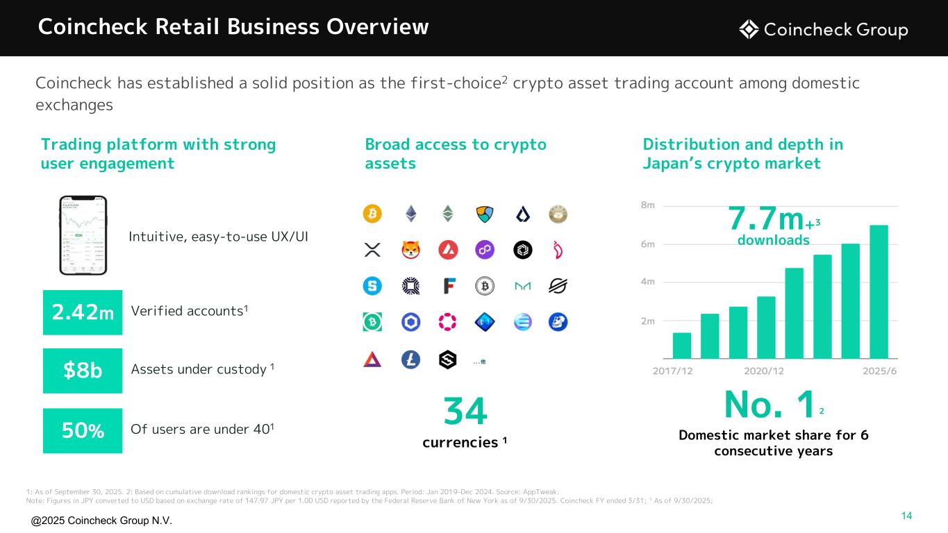 @2025 Coincheck Group N.V. No Offer or Solicitation This presentation is for informational purposes only and shall not constitute an offer to sell or the solicitation of an offer to buy any securities, nor shall there be any sale of securities in any states or jurisdictions in which such offer, solicitation, or sale would be unlawful prior to registration or qualification under the securities laws of any such jurisdiction. No offering of securities shall be made except by means of a prospectus meeting the requirements of Section 10 of the Securities Act of 1933, as amended, or an exemption therefrom. Cautionary Statement Regarding Forward-Looking Statements This presentation contains “forward-looking statements” within the meaning of U.S. federal securities laws. These forward-looking statements relate to expectations for future financial performance, business strategies or expectations for our business. In addition, any statements that refer to projections, forecasts or other characterizations of future events or circumstances, including any underlying assumptions, are forward-looking statements. Forward-looking statements are typically identified by words such as “plan,” “believe,” “expect,” “anticipate,” “intend,” “outlook,” “estimate,” “forecast,” “project,” “continue,” “could,” “may,” “might,” “possible,” “potential,” “predict,” “should,” “would” and other similar words and expressions, but the absence of these words does not mean that a statement is not forward-looking. These forward-looking statements are based on information available as of the date of this presentation and our managements’ current expectations, forecasts and assumptions, and involve a number of judgments, known and unknown risks and uncertainties and other factors, many of which are outside of our control. Accordingly, forward-looking statements should not be relied upon as representing our views as of any subsequent date. We do not undertake any obligation to update, add or to otherwise correct any forward-looking statements contained herein to reflect events or circumstances after the date they were made, whether as a result of new information, future events, inaccuracies that become apparent after the date hereof or otherwise, except as may be required under applicable securities laws. You are cautioned not to place undue reliance on these forward-looking statements, which speak only as of the date of this presentation. As a result of a number of known and unknown risks and uncertainties, actual results or performance may be materially different from those expressed or implied by these forward- looking statements. These risks and uncertainties include, but are not limited to, the price of crypto assets and volume of transactions on Coincheck’s platform; the development, utility and usage of crypto assets; changes in economic conditions and consumer sentiment in Japan; cyberattacks and security breaches on the Coincheck platform; demand for any particular crypto asset; adverse changes to any laws or regulations in the United States, Japan or the Netherlands or Coincheck’s failure to comply with any laws or regulations; administrative sanctions, including fines, or legal claims if we are found to have offered services in violations of the laws of jurisdictions other than Japan or to have violated international sanctions regimes; Coincheck’s ability to compete in a highly competitive industry; Coincheck’s ability to introduce new products and services; any interruptions in services provided by third-party service providers; the status of any particular crypto asset as a “security” in any relevant jurisdiction; legal, regulatory, and other risks in connection with our operation of the Coincheck NFT Marketplace that could adversely affect our business, operating results, and financial condition; our obligations to comply with the laws, rules, regulations, and policies of a variety of jurisdictions if we expand our international activities; the inability to maintain the listing of our Ordinary Shares on Nasdaq and other risk factors (the “Risk Factors”) discussed under "Item 3 - Key Information— D. Risk Factors" in the company's Shell Company Report on Form 20-F, filed with the U.S. Securities and Exchange Commission (SEC) on July 30, 2025. Actual results, performance or achievements may differ materially, and potentially adversely, from any projections and forward-looking statements and the assumptions on which those forward-looking statements are based. All information set forth herein speaks only as of the date hereof. Forecasts and estimates regarding Coincheck’s industry and end markets are based on sources we believe to be reliable, however there can be no assurance these forecasts and estimates will prove accurate in whole or in part. Annualized, pro forma, projected and estimated numbers are used for illustrative purpose only, are not forecasts and may not reflect actual results the ability to grow and manage growth profitably. Non-IFRS Financial Measures This presentation includes certain financial measures not prepared in accordance with IFRS, which constitute “non-IFRS financial measures” as defined by the rules of the SEC. The non-IFRS financial measures are EBITDA and Adjusted EBITDA. We believe that EBITDA and Adjusted EBITDA enhance an investor’s understanding of our financial and operating performance from period to period, because by excluding certain items that may not be indicative of our recurring core operating results, we believe that EBITDA and Adjusted EBITDA provide meaningful supplemental information regarding our financial and operating performance. In addition, we believe EBITDA and Adjusted EBITDA are measures commonly used by investors to evaluate other companies in our industry. However, there are limitations to the use of these non-IFRS financial measures as analytical tools and th