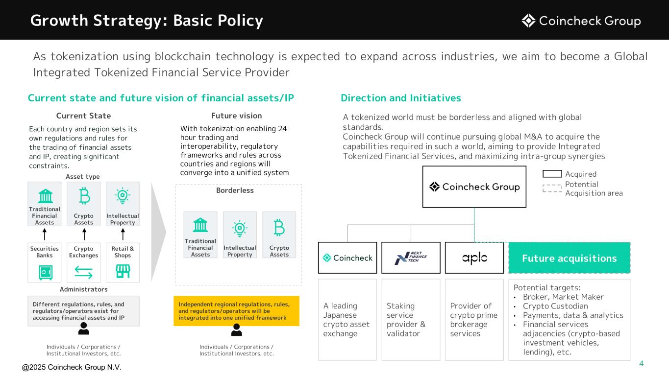 @2025 Coincheck Group N.V. 3 Overview of Coincheck Group 1: As of September 30, 2025. 2: Acquisition completed in October 2025. Our vision: To be a preeminent diversified crypto financial services holding company, driving the adoption and growth of the digital asset and web3 economy globally TSE Prime: 8698 83%1 Ownership NASDAQ-listed: CNCK Major shareholder 100% owned Leading Japanese crypto exchange 100% owned Global crypto staking services provider 2 100% owned Europe-based Crypto Prime Brokerage
