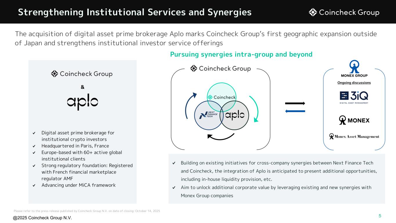 @2025 Coincheck Group N.V. The acquisition of digital asset prime brokerage Aplo marks Coincheck Group’s first geographic expansion outside of Japan and strengthens institutional investor service offerings Strengthening Institutional Services and Synergies ✔ Digital asset prime brokerage for institutional crypto investors ✔ Headquartered in Paris, France ✔ Europe-based with 60+ active global institutional clients ✔ Strong regulatory foundation: Registered with French financial marketplace regulator AMF ✔ Advancing under MiCA framework ✔ Building on existing initiatives for cross-company synergies between Next Finance Tech and Coincheck, the integration of Aplo is anticipated to present additional opportunities, including in-house liquidity provision, etc. ✔ Aim to unlock additional corporate value by leveraging existing and new synergies with Monex Group companies Please refer to the press release published by Coincheck Group N.V. on date of closing: October 14, 2025 & 5 Pursuing synergies intra-group and beyond Ongoing discussions