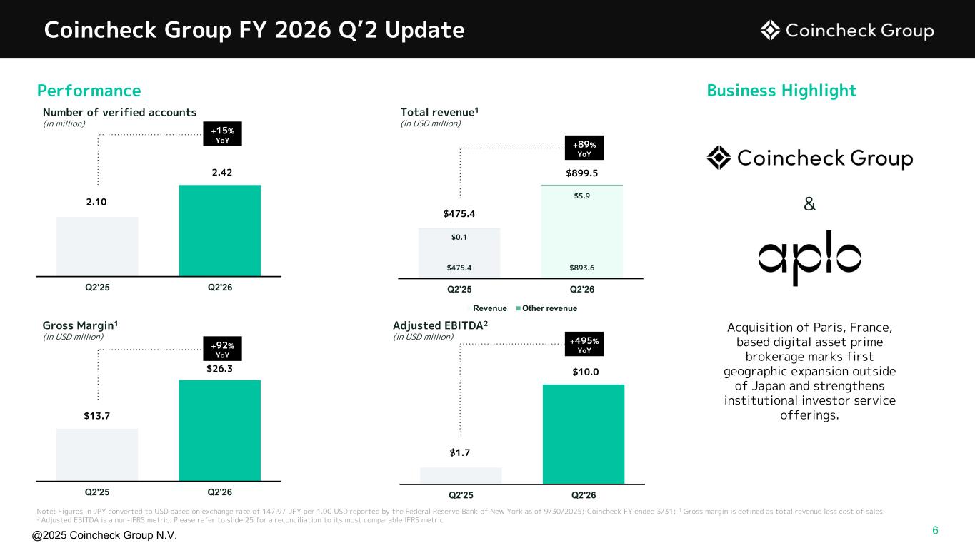 @2025 Coincheck Group N.V. $1.7 $10.0 Q2'25 Q2'26 $475.4 $893.6 $0.1 $5.9 $475.4 $899.5 Q2'25 Q2'26 Revenue Other revenue Coincheck Group FY 2026 Q’2 Update Note: Figures in JPY converted to USD based on exchange rate of 147.97 JPY per 1.00 USD reported by the Federal Reserve Bank of New York as of 9/30/2025; Coincheck FY ended 3/31; 1 Gross margin is defined as total revenue less cost of sales. 2 Adjusted EBITDA is a non-IFRS metric. Please refer to slide 25 for a reconciliation to its most comparable IFRS metric +89% YoY Total revenue1 (in USD million) Performance Number of verified accounts (in million) Gross Margin1 (in USD million) Adjusted EBITDA2 (in USD million) 2.10 2.42 Q2'25 Q2'26 +15% YoY $13.7 $26.3 Q2'25 Q2'26 6 +92% YoY +495% YoY Business Highlight & Acquisition of Paris, France, based digital asset prime brokerage marks first geographic expansion outside of Japan and strengthens institutional investor service offerings.