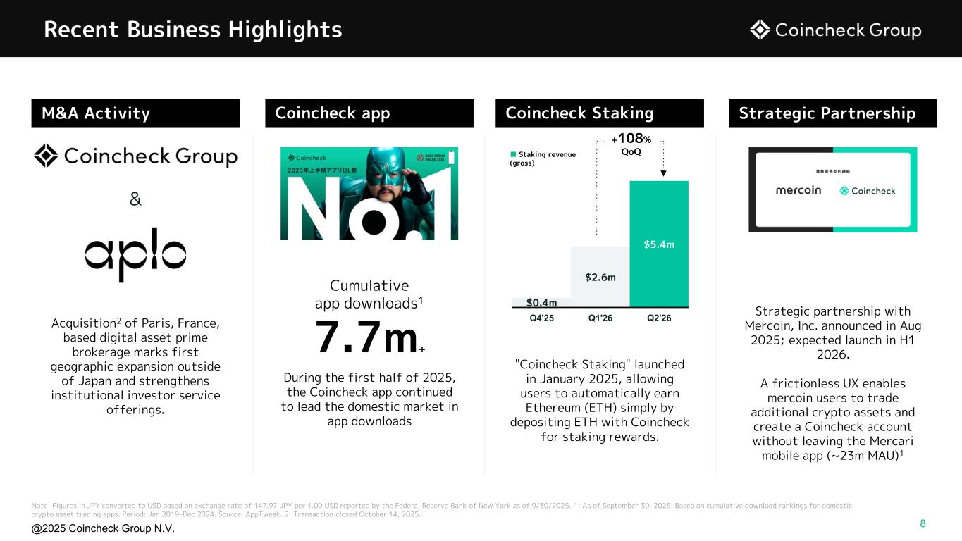@2025 Coincheck Group N.V. Coincheck Group Results for FY 2024, 2025, & 2026 Q1-Q2 Number of Verified Accounts 2.42M +15% YoY $8B +78% YoY Customer Assets1 $640M +54% vs. QoQ FY26 Q2 Marketplace Trading Volume ($M) FY24 FY25 % YoY FY26 Q1 FY26 Q2 % QoQ Revenue $1,514 $2,591 71% $568 $900 58% Cost of sales $1,451 $2,499 72% $549 $875 59% Net Profit (Loss) $13.3 ($96.9) (830%) ($9.3) $2.4 — EBITDA2 $23.8 ($85.2) (458%) ($7.2) $7.6 — Adj. EBITDA2, 3 $25.5 $38.6 52% ($2.7) $10.0 — Note: Figures in JPY converted to USD based on exchange rate of 147.97 JPY per 1.00 USD reported by the Federal Reserve Bank of New York as of 9/30/2025; Coincheck FY ended 3/31; 1 Does not include NFTs deposited by customers; 2 EBITDA and Adjusted EBITDA are non-IFRS metrics. Please refer to slide 24 for a reconciliation to their most comparable IFRS metric; 3 Adjusted EBITDA figure, which excludes listing fees and professional fees in connection with the reverse capitalization. Adj. EBITDA is a non-IFRS metric. Please refer to slide 24 for a reconciliation to its most comparable IFRS metric $13.5B -10% QoQ FY26 Q2 Exchange Trading Volume 7