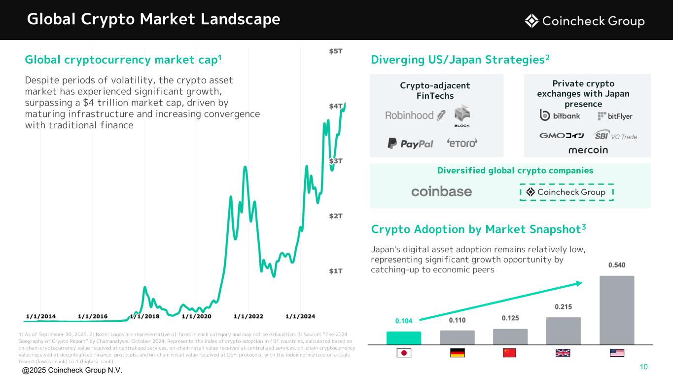 @2025 Coincheck Group N.V. $0 $20,000 $40,000 $60,000 $80,000 $100,000 $120,000 Oct-15 Oct-17 Oct-19 Oct-21 Oct-23 Oct-25 9 Significant Crypto Market Tailwinds ✔ $4T+1 crypto market cap ✔ Bitcoin and Ether U.S. ETF approvals ✔ Passage / implementation of MiCA in Europe ✔ Passage of Japan stablecoin bill ✔ Adoption of SAB 122 (Jan-25) ✔ Supportive regulatory posturing appears to be emerging from SEC, CFTC, and OCC ✔ GENIUS Act (signed Jul-25); STABLE Act and CLARITY Act (in Congress) 1Source: CoinGecko. Note: As of Sep 30, 2025 +47,862% $114,024* BTC price evolution1 over the past 10 years Notable global market developments