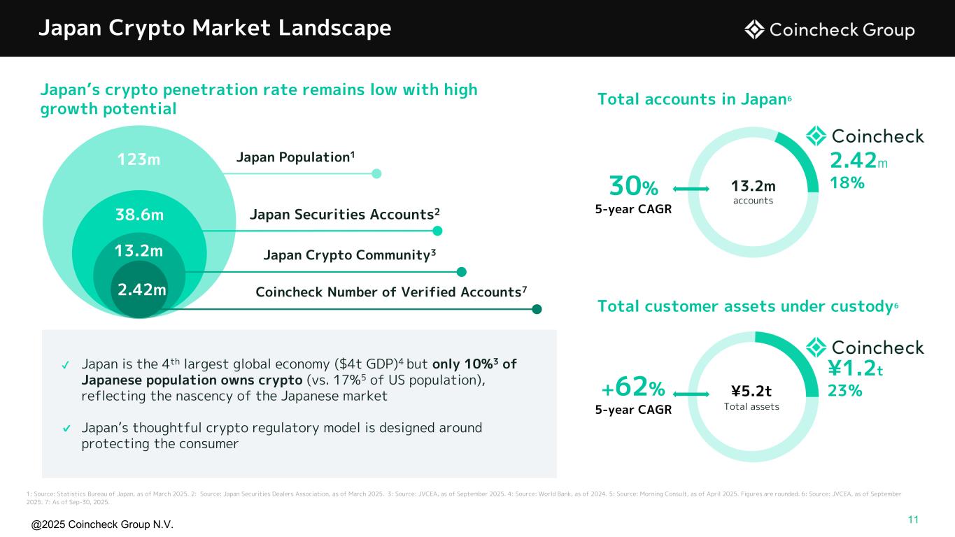 @2025 Coincheck Group N.V. 2.42m 18% ✔ Japan is the 4th largest global economy ($4t GDP)4 but only 10%3 of Japanese population owns crypto (vs. 17%5 of US population), reflecting the nascency of the Japanese market ✔ Japan’s thoughtful crypto regulatory model is designed around protecting the consumer Japan Crypto Market Landscape 1: Source: Statistics Bureau of Japan, as of March 2025. 2: Source: Japan Securities Dealers Association, as of March 2025. 3: Source: JVCEA, as of September 2025. 4: Source: World Bank, as of 2024. 5: Source: Morning Consult, as of April 2025. Figures are rounded. 6: Source: JVCEA, as of September 2025. 7: As of Sep-30, 2025. Total accounts in Japan6 Total customer assets under custody6 ¥5.2t Total assets 2.42m 13.2m 123m Japan Population1 Japan Crypto Community3 Coincheck Number of Verified Accounts7 Japan’s crypto penetration rate remains low with high growth potential 30% 5-year CAGR +62% 5-year CAGR 13.2m accounts ¥1.2t 23% Japan Securities Accounts238.6m 11