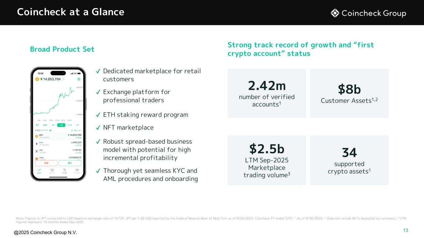 @2025 Coincheck Group N.V. Coincheck, a Leading Japanese Crypto Platform Providing Japanese Customers & Institutions with Direct Access to the Global Crypto Economy • Wholly-owned subsidiary of Coincheck Group • Leading Japanese crypto exchange • Operates one of the largest domestic multi-cryptocurrency marketplaces and crypto asset exchanges in Japan • Services supporting 341 cryptocurrencies on our Marketplace and Exchange platforms for trading and custody, as well as other crypto activities including Initial Exchange Offerings (IEOs) and NFTs • Registered crypto asset exchange service provider with the Financial Services Agency of Japan (JFSA) • Operates under the Japan Virtual Currency Exchange Associate (JVCEA), a self-regulatory organization that governs Japan’s crypto exchanges 1 As of September 30, 2025 12