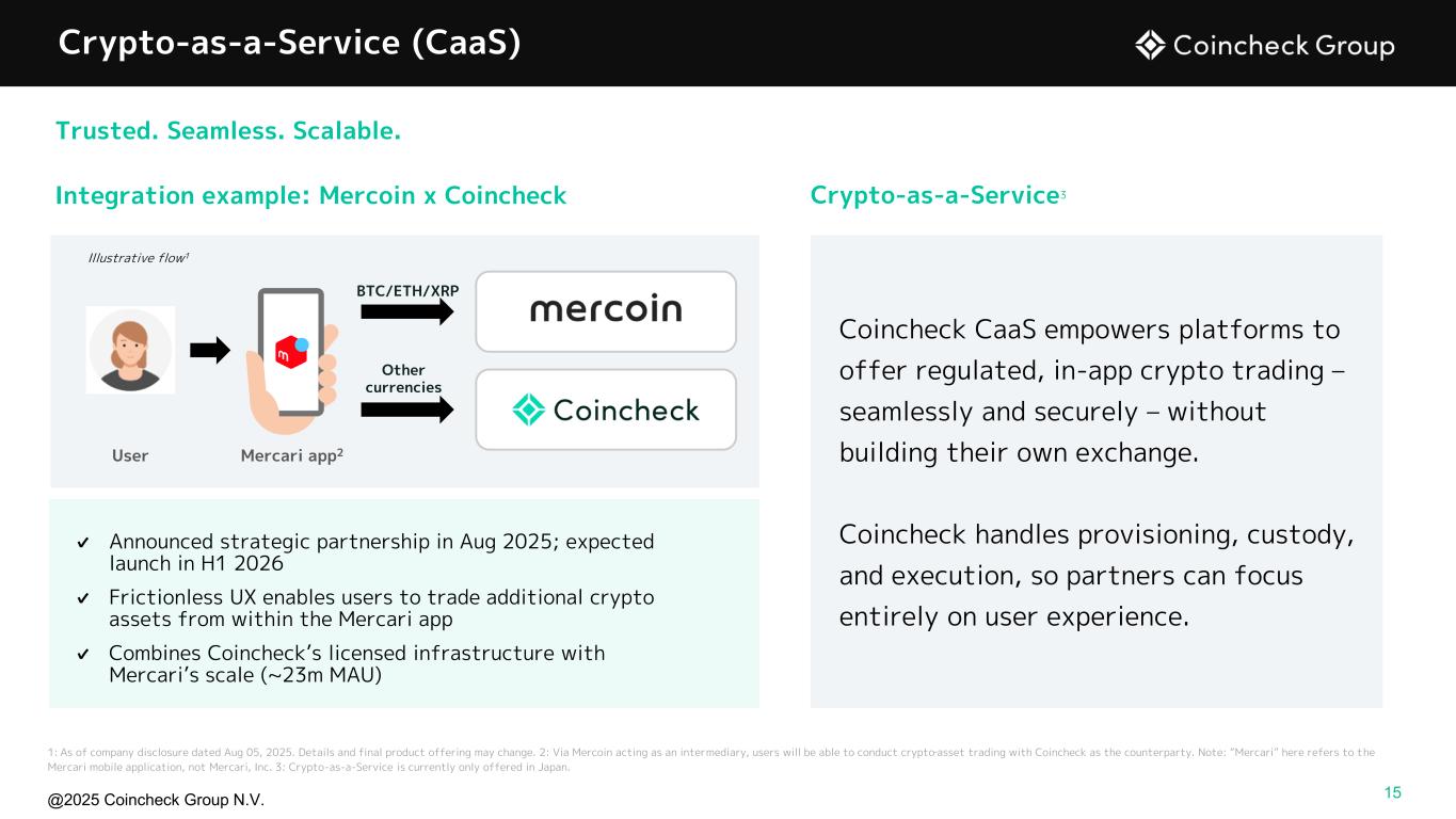 @2025 Coincheck Group N.V. Coincheck has established a solid position as the first-choice2 crypto asset trading account among domestic exchanges No. 12 Domestic market share for 6 consecutive years Coincheck Retail Business Overview 1: As of September 30, 2025. 2: Based on cumulative download rankings for domestic crypto asset trading apps. Period: Jan 2019–Dec 2024. Source: AppTweak. Note: Figures in JPY converted to USD based on exchange rate of 147.97 JPY per 1.00 USD reported by the Federal Reserve Bank of New York as of 9/30/2025. Coincheck FY ended 3/31; 1 As of 9/30/2025; Distribution and depth in Japan’s crypto market 2m 4m 6m 8m 2017/12 2020/12 2025/6 Broad access to crypto assets 34 currencies 1 2.42m Verified accounts1 Assets under custody 1$8b Of users are under 401 7.7m+3 downloads 50% Trading platform with strong user engagement Intuitive, easy-to-use UX/UI 14