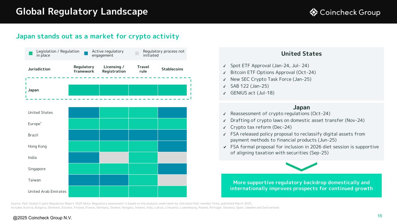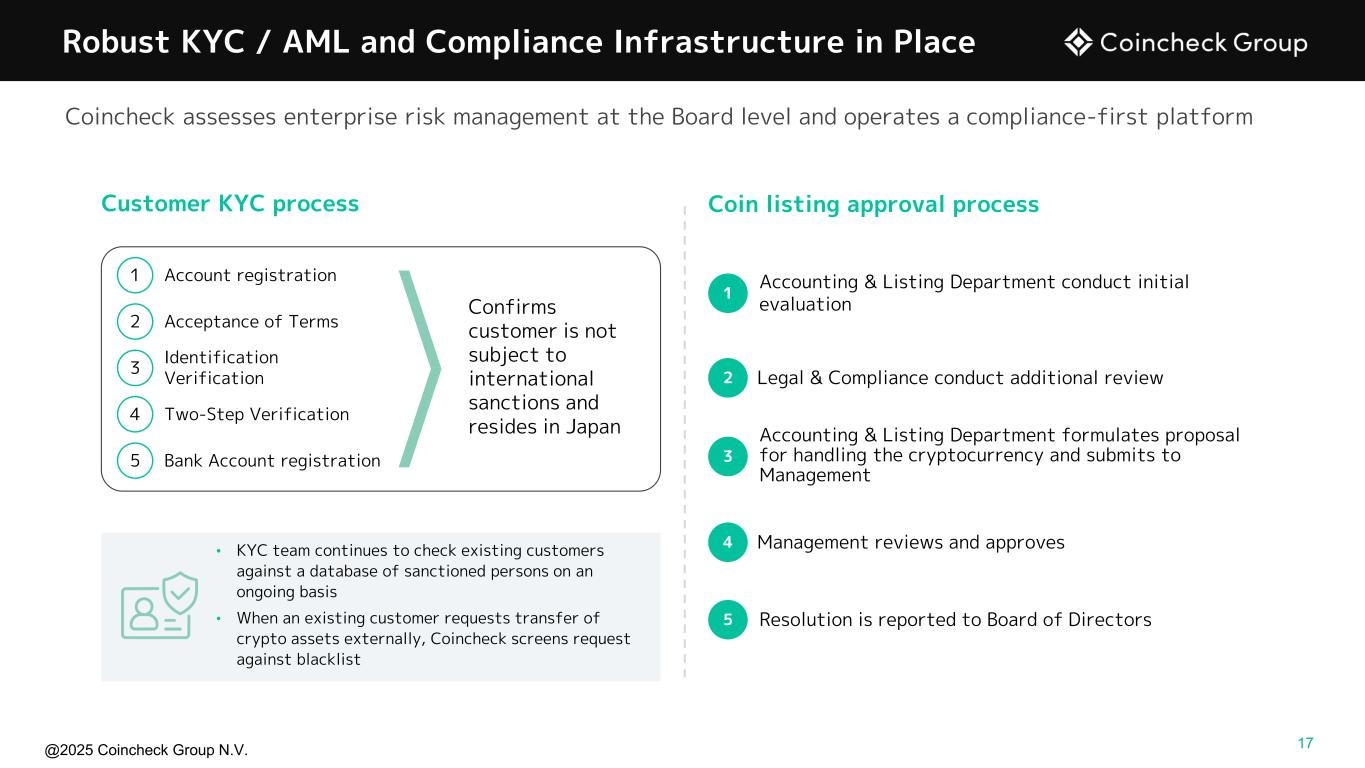 @2025 Coincheck Group N.V. Japan stands out as a market for crypto activity Global Regulatory Landscape Jurisdiction Regulatory framework Licensing / Registration Travel rule Stablecoins Japan United States Europe* Brazil Hong Kong India Singapore Taiwan United Arab Emirates Legislation / Regulation in place Active regulatory engagement Regulatory process not initiated ✔ Spot ETF Approval (Jan-24, Jul– 24) ✔ Bitcoin ETF Options Approval (Oct-24) ✔ New SEC Crypto Task Force (Jan-25) ✔ SAB 122 (Jan-25) ✔ GENIUS act (Jul-18) United States ✔ Reassessment of crypto regulations (Oct-24) ✔ Drafting of crypto laws on domestic asset transfer (Nov-24) ✔ Crypto tax reform (Dec-24) ✔ FSA released policy proposal to reclassify digital assets from payment methods to financial products (Jun-25) ✔ FSA formal proposal for inclusion in 2026 diet session is supportive of aligning taxation with securities (Sep-25) Japan Source: PwC Global Crypto Regulation Report 2025 Note: Regulatory assessment is based on the analysis undertaken by individual PwC member firms, published March 2025. Includes Austria, Bulgaria, Denmark, Estonia, Finland, France, Germany, Greece, Hungary, Ireland, Italy, Latvia, Lithuania, Luxembourg, Poland, Portugal, Slovakia, Spain, Sweden and Switzerland More supportive regulatory backdrop domestically and internationally improves prospects for continued growth 16