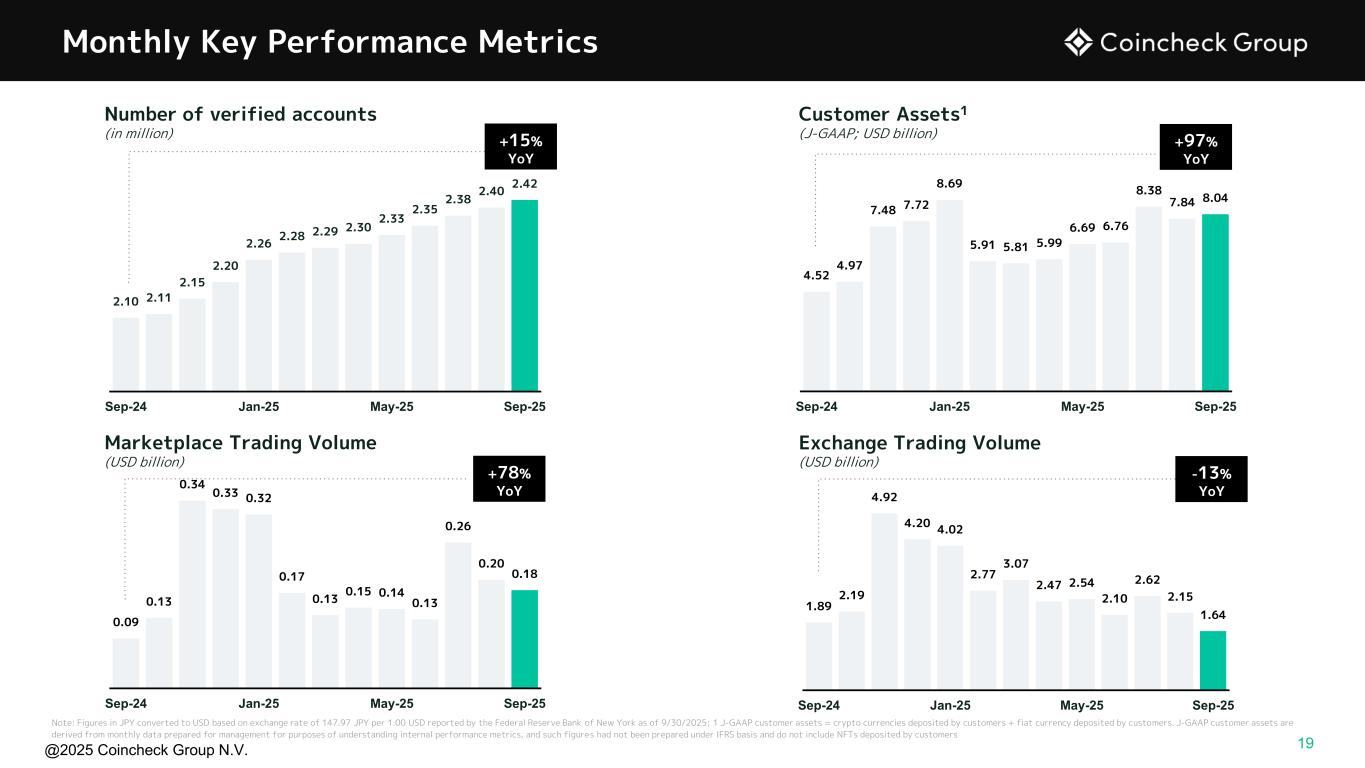@2025 Coincheck Group N.V. 19 Monthly Key Performance Metrics Note: Figures in JPY converted to USD based on exchange rate of 147.97 JPY per 1.00 USD reported by the Federal Reserve Bank of New York as of 9/30/2025; 1 J-GAAP customer assets = crypto currencies deposited by customers + fiat currency deposited by customers. J-GAAP customer assets are derived from monthly data prepared for management for purposes of understanding internal performance metrics, and such figures had not been prepared under IFRS basis and do not include NFTs deposited by customers Number of verified accounts (in million) Customer Assets1 (J-GAAP; USD billion) 2.10 2.11 2.15 2.20 2.26 2.28 2.29 2.30 2.33 2.35 2.38 2.40 2.42 Sep-24 Jan-25 May-25 Sep-25 +15% YoY 4.52 4.97 7.48 7.72 8.69 5.91 5.81 5.99 6.69 6.76 8.38 7.84 8.04 Sep-24 Jan-25 May-25 Sep-25 +97% YoY 0.09 0.13 0.34 0.33 0.32 0.17 0.13 0.15 0.14 0.13 0.26 0.20 0.18 Sep-24 Jan-25 May-25 Sep-25 1.89 2.19 4.92 4.20 4.02 2.77 3.07 2.47 2.54 2.10 2.62 2.15 1.64 Sep-24 Jan-25 May-25 Sep-25 Marketplace Trading Volume (USD billion) Exchange Trading Volume (USD billion) +78% YoY -13% YoY