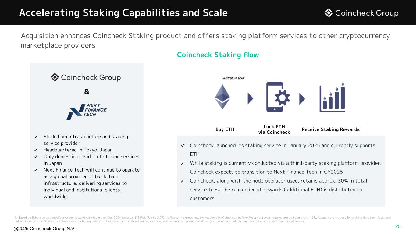 @2025 Coincheck Group N.V. Accelerating Staking Capabilities and Scale ✔ Blockchain infrastructure and staking service provider ✔ Headquartered in Tokyo, Japan ✔ Only domestic provider of staking services in Japan ✔ Next Finance Tech will continue to operate as a global provider of blockchain infrastructure, delivering services to individual and institutional clients worldwide Illustrative flow Buy ETH Lock ETH via Coincheck Receive Staking Rewards ✔ Coincheck launched its staking service in January 2025 and currently supports ETH ✔ While staking is currently conducted via a third-party staking platform provider, Coincheck expects to transition to Next Finance Tech in CY2026 ✔ Coincheck, along with the node operator used, retains approx. 30% in total service fees. The remainder of rewards (additional ETH) is distributed to customers 1: Based on Ethereum protocol’s average reward rate from Jan–Dec 2024 (approx. 3.32%). “Up to 2.7%” reflects the gross reward received by Coincheck before fees; customer returns are up to approx. 1.9%. Actual returns vary by staking duration, fees, and network conditions. Staking involves risks, including validator failure, smart contract vulnerabilities, and network-imposed penalties (e.g., slashing), which may result in partial or total loss of assets. & Coincheck Staking flow 20 Acquisition enhances Coincheck Staking product and offers staking platform services to other cryptocurrency marketplace providers
