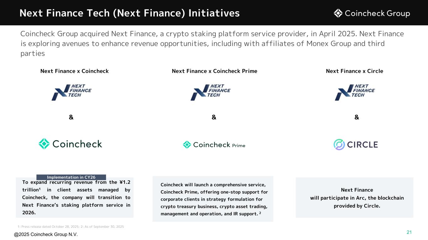 @2025 Coincheck Group N.V. Next Finance Tech (Next Finance) Initiatives Next Finance x Coincheck Prime Next Finance x CircleNext Finance x Coincheck To expand recurring revenue from the ¥1.2 trillion1 in client assets managed by Coincheck, the company will transition to Next Finance’s staking platform service in 2026. Coincheck will launch a comprehensive service, Coincheck Prime, offering one-stop support for corporate clients in strategy formulation for crypto treasury business, crypto asset trading, management and operation, and IR support. 2 Next Finance will participate in Arc, the blockchain provided by Circle. Implementation in CY26 1: Press release dated October 28, 2025; 2: As of September 30, 2025 Coincheck Group acquired Next Finance, a crypto staking platform service provider, in April 2025. Next Finance is exploring avenues to enhance revenue opportunities, including with affiliates of Monex Group and third parties & & & 21