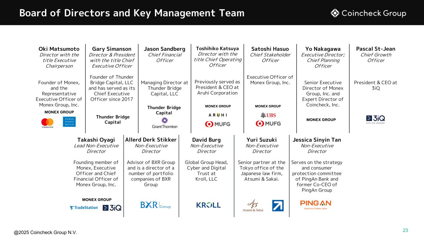 @2025 Coincheck Group N.V. Oki Matsumoto Director with the title Executive Chairperson Founder of Monex, and the Representative Executive Officer of Monex Group, Inc. Gary Simanson Director & President with the title Chief Executive Officer Founder of Thunder Bridge Capital, LLC and has served as its Chief Executive Officer since 2017 Jason Sandberg Chief Financial Officer Managing Director at Thunder Bridge Capital, LLC Toshihiko Katsuya Director with the title Chief Operating Officer Previously served as President & CEO at Aruhi Corporation Satoshi Hasuo Chief Stakeholder Officer Executive Officer of Monex Group, Inc. Yo Nakagawa Executive Director; Chief Planning Officer Senior Executive Director of Monex Group, Inc. and Expert Director of Coincheck, Inc. Pascal St-Jean Chief Growth Officer President & CEO at 3iQ Takashi Oyagi Lead Non-Executive Director Founding member of Monex, Executive Officer and Chief Financial Officer of Monex Group, Inc. Allerd Derk Stikker Non-Executive Director Advisor of BXR Group and is a director of a number of portfolio companies of BXR Group David Burg Non-Executive Director Global Group Head, Cyber and Digital Trust at Kroll, LLC Yuri Suzuki Non-Executive Director Senior partner at the Tokyo office of the Japanese law firm, Atsumi & Sakai. Jessica Sinyin Tan Non-Executive Director Serves on the strategy and consumer protection committee of PingAn Bank and former Co-CEO of PingAn Group Board of Directors and Key Management Team Thunder Bridge Capital Thunder Bridge Capital 23